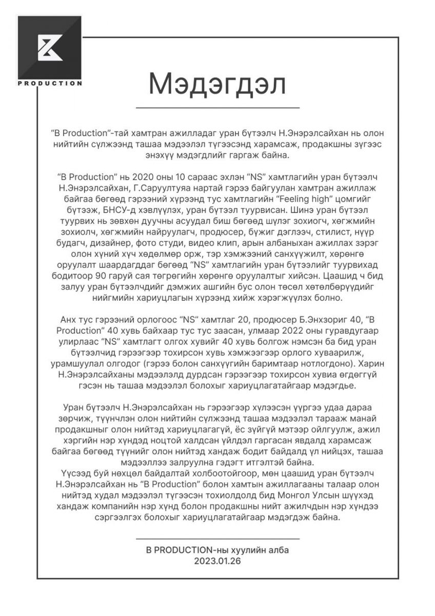 "The Voice Of Mongolia" шоунаас төрсөн охидын NS хамтлагийн гишүүн Н.Энэрэлсайхан өнгөрсөн долоо хоногт Төрийн соёрхолт дуучин Д.Болдын "B production"-тай хийсэн гэрээ болон ажлын үйл явцын тухай олон нийтэд дэлгэсэн билээ.