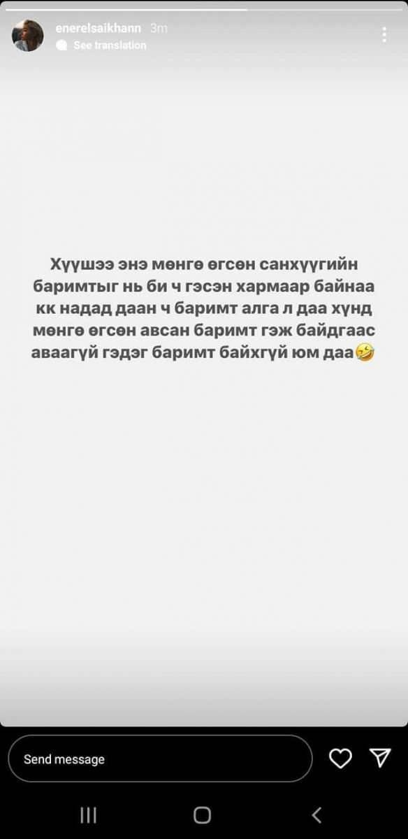 Харин үүн дараа дуучин Н.Энэрэлсайхан "B production"-ы мэдэгдлийг үгүйсгэж, "Мөнгө өгсөн баримт байвал би ч гэсэн хармаар" гэж өөрийн инстаграмаар дамжуулан, бичжээ.