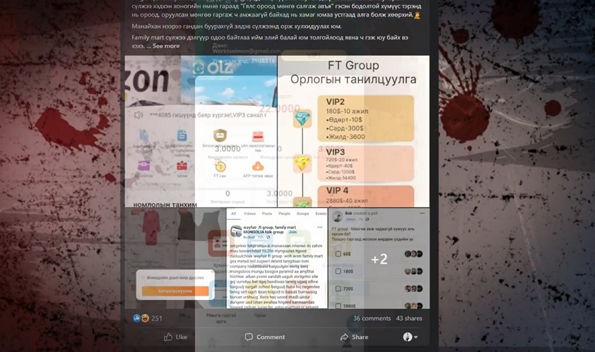 Цахим орчинд “FT GROUP”, “FAMILYMART”, “WAYFAIR” гэх нэршилтэй хэрэглээний программ ашиглан, иргэдээс 60-20 000 ам.долларын барьцаа байршуулж залилсан үйлдлийг цагдаагийн байгууллага шалгаж байна.