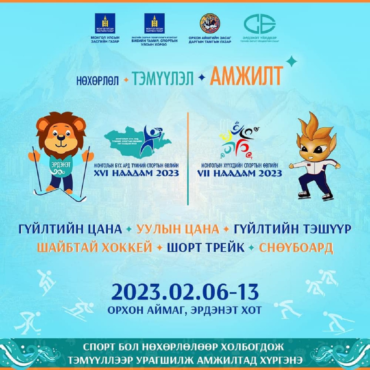 Мөн Орхон аймаг, Эрдэнэт хотыг зэс, оюу өнгөөр тодорхойлжээ. Шаргал өнгөөр зэсийг, номин ногоон өнгөөр оюуг, цайвар цэнхэр өнгөөр мөсийг бэлгэдсэн нь энэ удаагийн өвлийн спортын наадмын өнгө төрхийг тодорхойлжээ. ХЭЧНЭЭН ТӨРӨЛД БОЛОХ ВЭ? Өвлийн олимпийн наадмын хөтөлбөрт багтдаг гүйлтийн цана, уулын цана, гүйлтийн тэшүүр, шорт трейк, шайбтай хоккей, снөүборд гэсэн зургаан спортын төрлийн зай, ангиллаар зохион байгуулна.