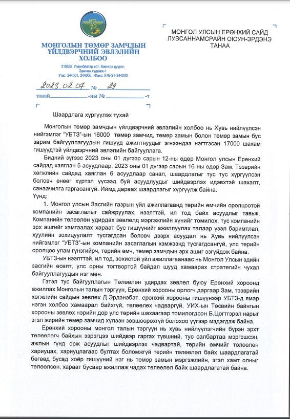 Монголын Төмөр замчдын үйлдвэрчний эвлэлийн холбооноос Ерөнхий сайд Л.Оюун-Эрдэнэд хаягалан өнөөдөр /2023.02.07/ шаардлага хүргүүллээ.