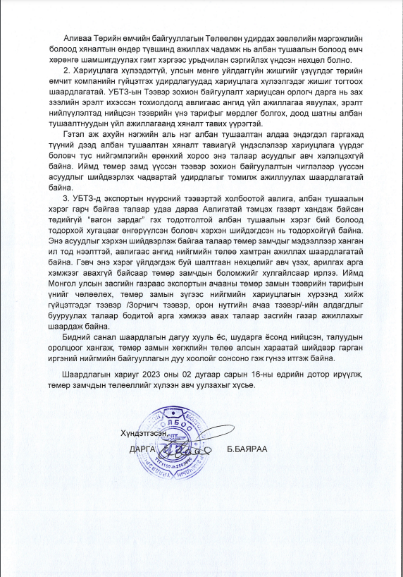 Мөн экспортын ачааны төмөр замын тээврийн тарифын үнийг чөлөөлөх, тээвэр алдагдалтыг бууруулах тал дээр бодитой арга хэмжээ авахыг тус тус шаардсан байна. Шаардлагын хариуг хоёрдугаар сарын 16-ны дотор ирүүлэхийг хүсжээ.