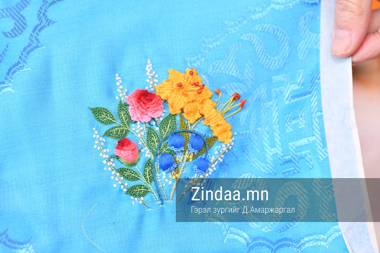 -Өвөрмөц гэхээсээ илүүтэй захиалагчаа хараад энэ хүнд ийм зүйл оёод өгчих юм сан гэсэн хүсэл төрдөг л дөө. Жишээ нь энэ хавтаганы эзэн хүүхэд Шинэцэцэг гэдэг нэртэй хүүхэд байгаа юм. Ээж нь баглаа цэцэг шиг хийлгэмээр байна гэж хэлж байсан. Бяцхан охинд оёж байгаа учраас цэцгийг наашаа төвийлгөж бодит юм шиг урлавал тухайн хүний маань сэтгэл нь баясах юм болов уу гэж бодсон. Энэ хавтагыг тухайн хүн маань насан туршдаа сүсэглээд явах юм бол ажил үйлс нь бүтэмжтэй, нэг төрлийн хамгаалалт болж өгдөг. Зориулж оёсон бүтээл эзэндээ үргэлж сайн сайхан зүйл дагуулдаг.
