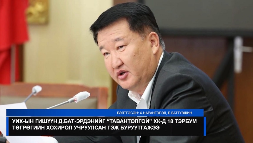 Өнөөгийн парламентаас нүүрсний хулгайн хэрэгт нэр бүхий 7 гишүүн холбогдож, яллагдагчаар татагдаад байна. Эдгээрээс нэр бүхий зургаан гишүүний хэргийг АТГ шалгаж байгаа бол нэг гишүүнийг Эрүүгийн цагдаагийн газраас шалгаж байна. Тодруулбал, УИХ-ын гишүүн Дашдэмбэрэлийн Бат-Эрдэнийг Эрүүгийн цагдаагийн газраас шалгаж яллагдагчаар татан, хилийн хориг тавиад байгаа. Тэрбээр орон нутгийн өмчит "Тавантолгой" ХК-иас алдагдсан нүүрсний хулгайн хэрэг болон хөрөнгө завших гэмт хэрэгт холбогдоод байгаа юм. Энэ талаар ТВ8 телевизийн "ТОЛЬ" мэдээллийн хөтөлбөр дараах мэдээллийг бэлтгэжээ.
