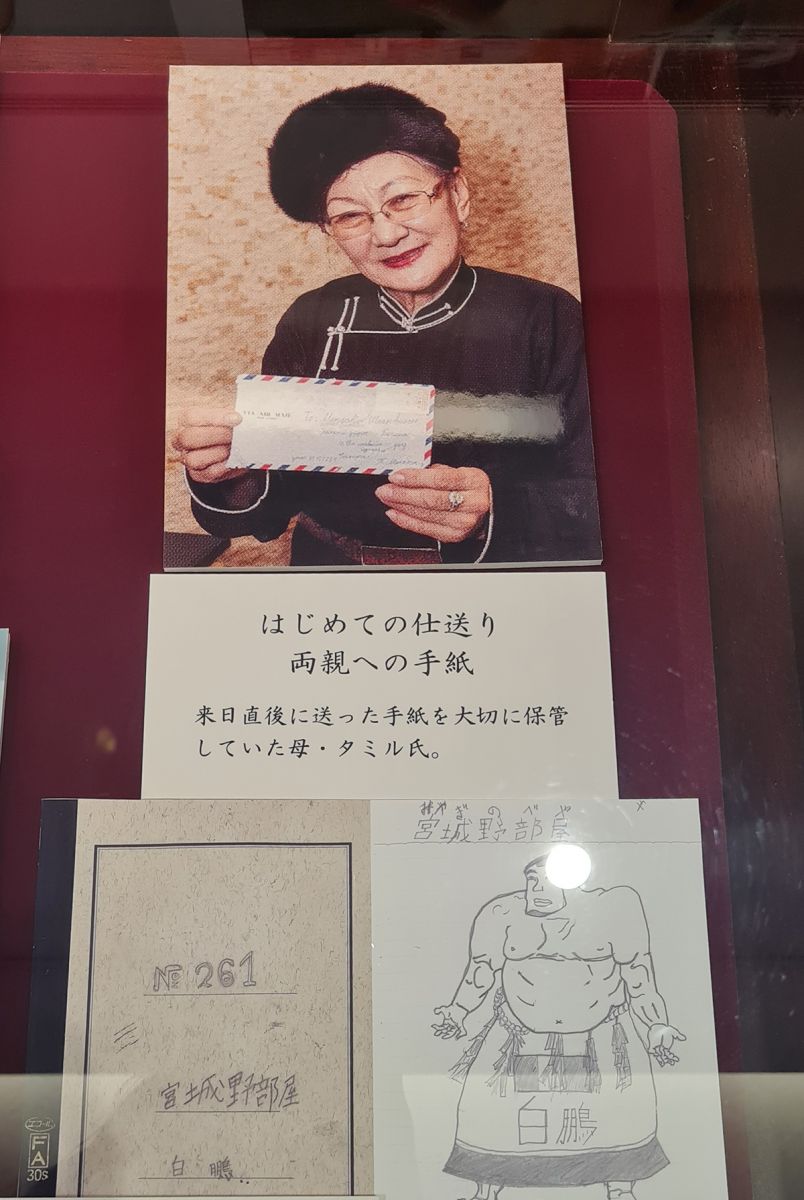 Дараагийн зогсоол бол Сумогийн музей. Монгол хүмүүс Арлын Япон гэхээр л андахгүй мэддэг, сонирхдог болсон шалтгаануудын нэг бол яах аргагүй сумо бөх гэхэд хол зөрөхгүй л болов уу. Үүдээр нь ороход Арлын орныг доргиосон Монгол сумочдын хөрөг харагдана. Тэр дундаа Хакүхо М.Даваажаргал аваргын өсвөр насны монгол бөхийн өмсгөлтэй зураг, 2001 онд Японы мэргэжлийн сумод анх барилдаж байсан үеийн зураг, мөн аав, ээжийнх нь зураг хадгалагдан үлдсэн нь бахархам сэтгэл төрүүлнэ. Музейн тайлбарлагч биднийг элгэмсүү хүлээн авсан нь Хакүхог дэмждэг бөгөөд монгол хүн гэхээр л бахархах сэтгэл төрөн хүндэлдэг гэсэн юм.