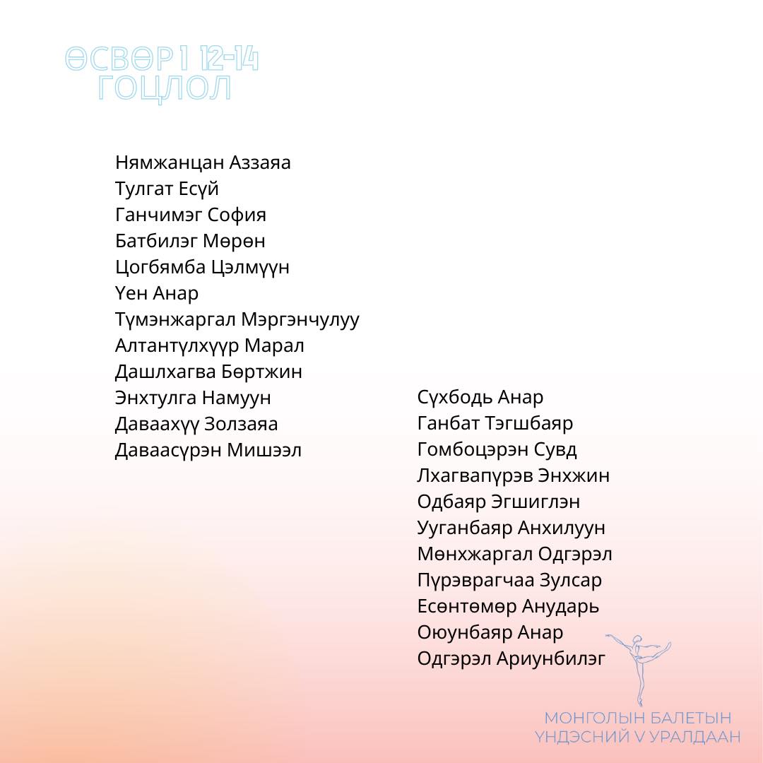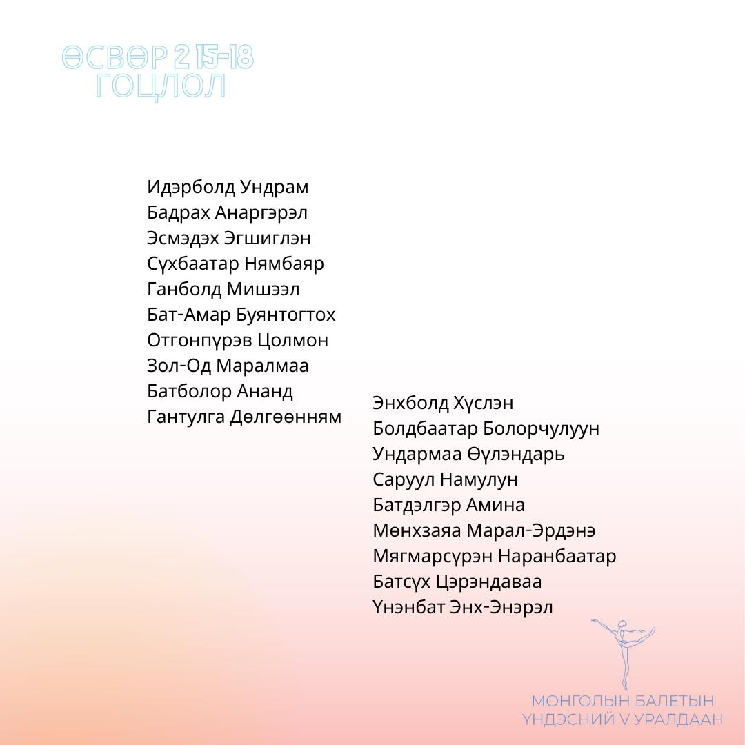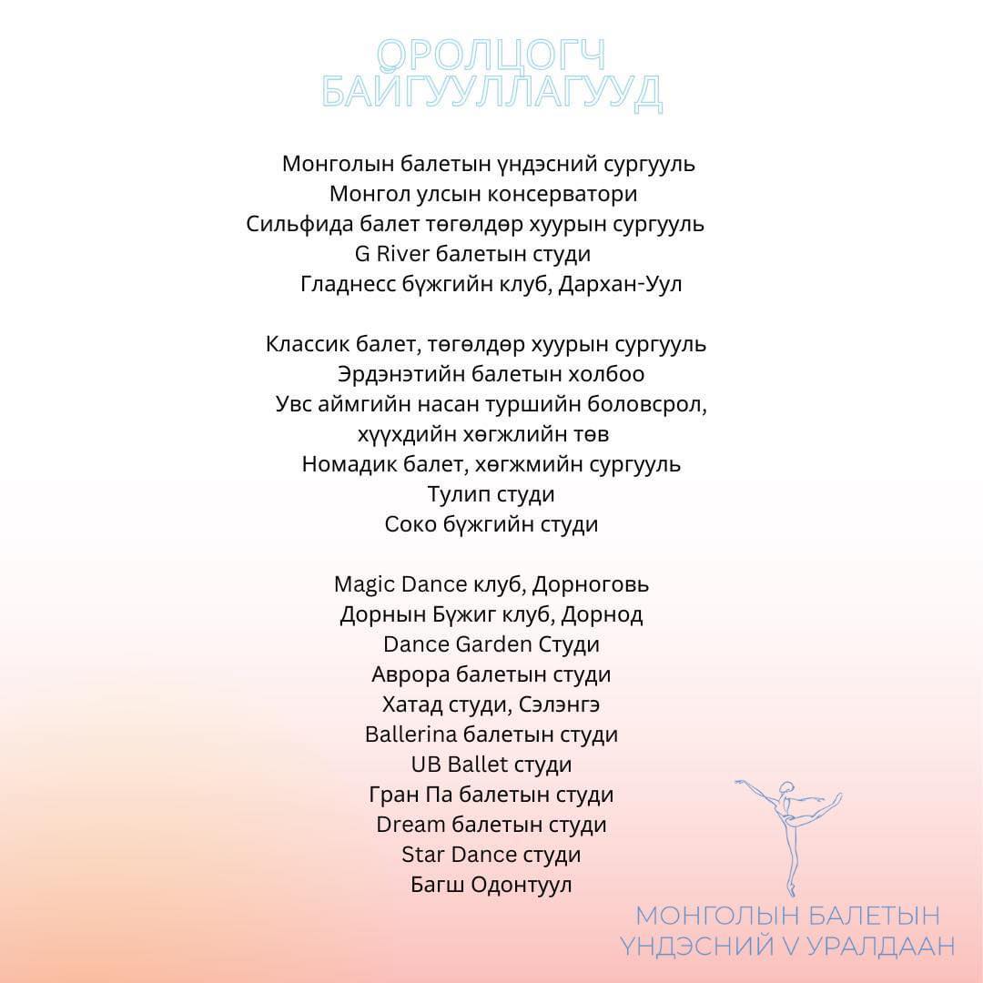 Оролцогчид болох 6-18 насны сурагчид хийгээд залуу бүжигчид Сонгодог балетын багийн болон Гоцлол бүжгийн төрлөөр өрсөлдөх ба бүртгэл гуравдугаар сарын 24-нийг дуустал үргэлжилж, оролцогчдоо тодрууллаа.