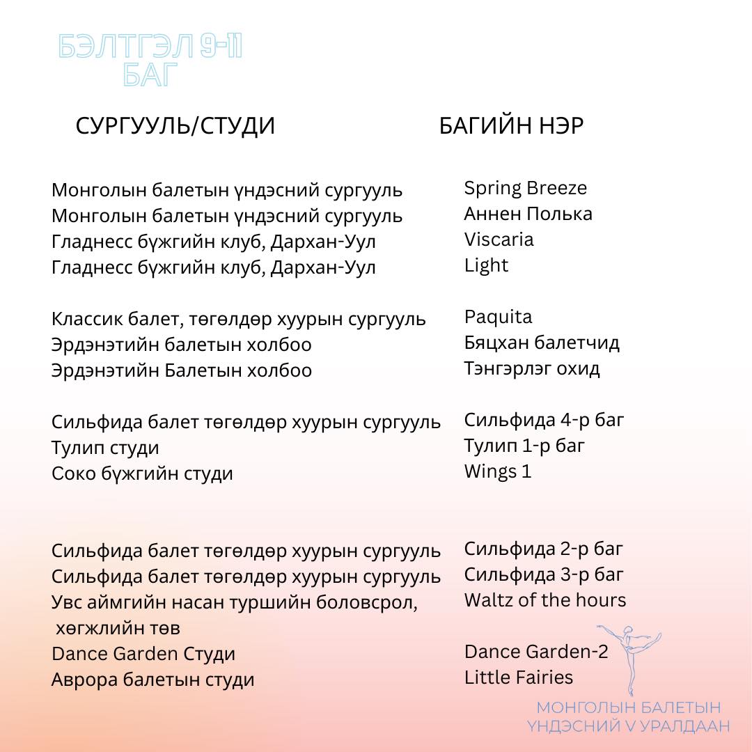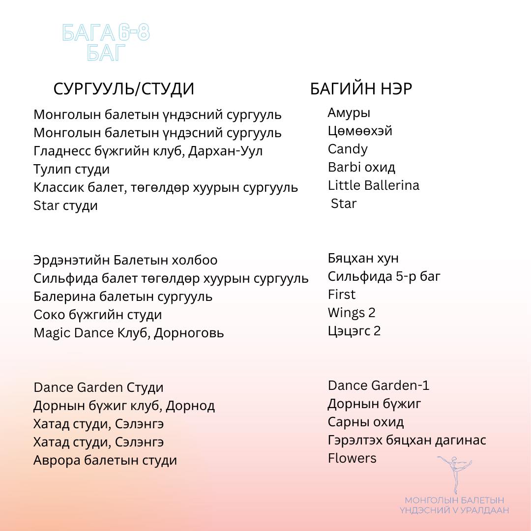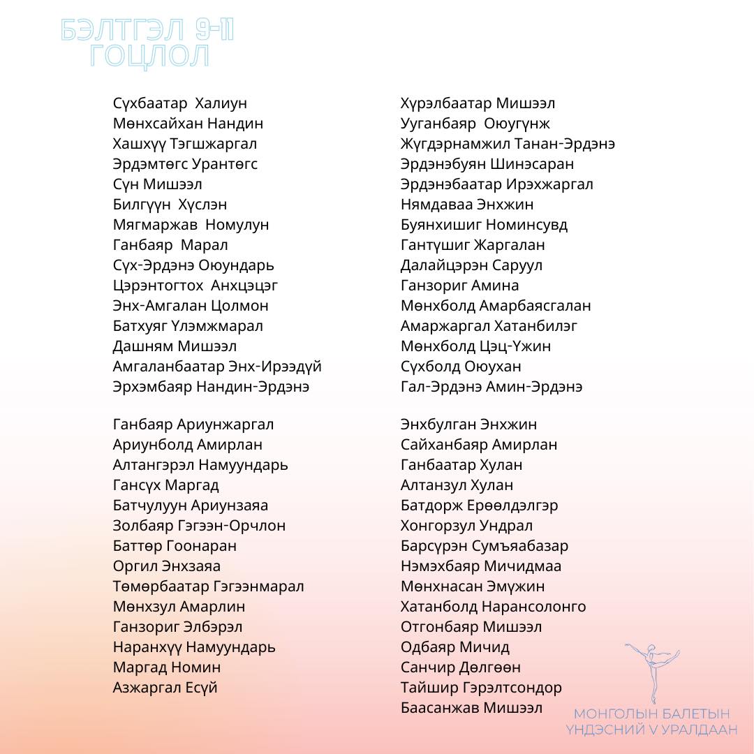 Оролцогчид болох 6-18 насны сурагчид хийгээд залуу бүжигчид Сонгодог балетын багийн болон Гоцлол бүжгийн төрлөөр өрсөлдөх ба бүртгэл гуравдугаар сарын 24-нийг дуустал үргэлжилж, оролцогчдоо тодрууллаа.