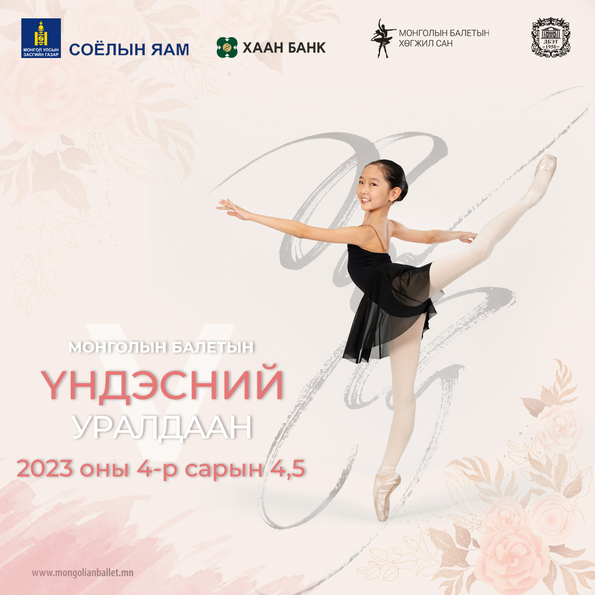 Гавьяат жүжигчин, нэрт балетчин Д.Алтанхуягийн тэргүүлдэг “Монголын балетын хөгжил сан”-гаас санаачлан зохион байгуулж ирсэн Балетын үндэсний V уралдаан ирэх дөрөвдүгээр сарын 4, 5-ны мягмар, лхагва гарагт Улсын Дуурь, бүжгийн эрдмийн театр (УДБЭТ)-т болно.