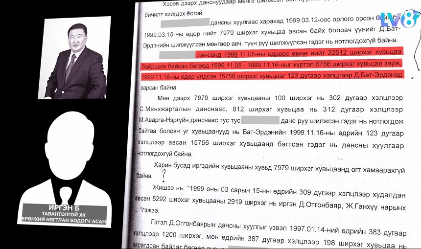 Та бүхний харж байгааа энэ баримт бол нэр бүхий 23 иргэний өмчилж байсан Тавантолгойн хувьцааг тэдний зөвшөөрөлгүйгээр бусдад шилжүүлсэн гэдгийг нотлох баримт. Энэ баримт бол нэр бүхий 23 иргэний хулгайлагдсан хувьцаа хэн гэгч хүмүүсийн данс руу орсон бэ гэдгийг нотолно. Иргэдийн хулгайлагдсан гэх хувьцаа хэний данс руу орсон бэ гэдгийг харвал 11 иргэний 7023 ширхэг хувьцаа Дашдэмбэрэлийн Бат-Эрдэнийн данс руу, 5 иргэний 1429 ширхэг хувьцаа Романовскийн данс руу, 2 иргэний 664 ширхэг хувьцаа Өлзийхишигийн данс руу, 2 иргэний 836 ширхэг хувьцаа Ээрмэл компанийн данс руу оржээ.
