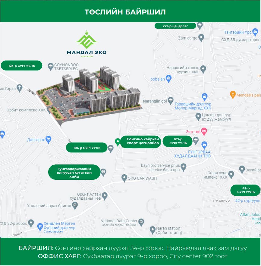 Байршил: Сонгинохайрхан дүүрэг, 34 дүгээр хороо, “Найрамдал” зуслан явах зам дагуу, “Мандал эко хотхон”