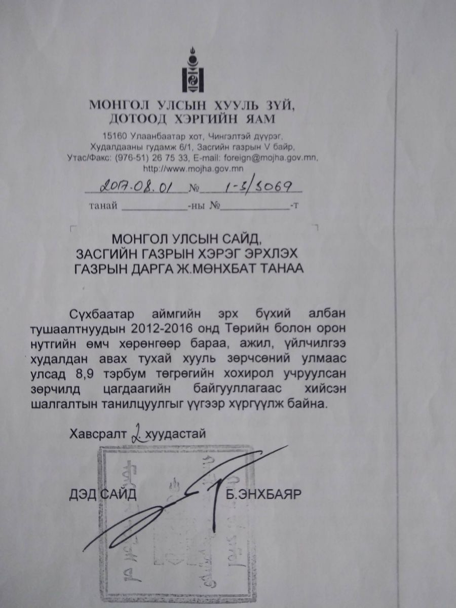 ДЭД САЙД Б.ЭНХБАЯР ЗГХЭГ-ЫН ДАРГАД Ж.БАТСУУРЬ НАРЫН УЛСАД ХОХИРОЛ УЧРУУЛСАН ТАЛААР АЛБАН ТООТ ХҮРГҮҮЛЖ БАЙЖ
