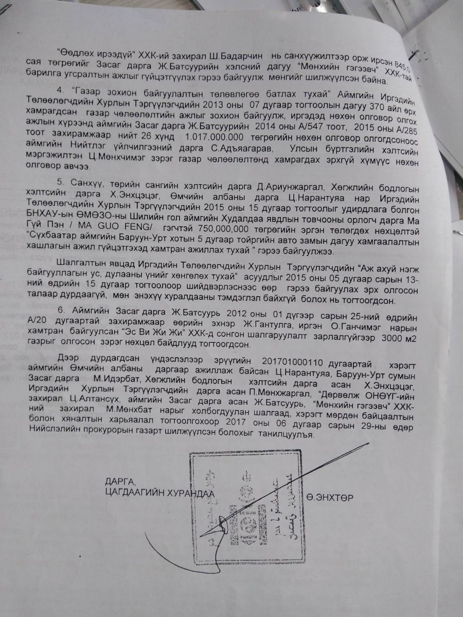 Иинхүү Цагдаагийн ерөнхий газраас Хууль зүй, дотоод хэргийн сайдад хүргүүлсэн танилцуулгаас харахад дээрх хэргүүд хөвөрнө. Эцэст нь дурдахдаа “Дээр дурдагдсан үндэслэлээр эрүүгийн ..... тоот дугаартай хэрэгт аймгийн Өмчийн албаны даргаар ажиллаж байсан Ц.Нарантуяа, Баруун-Урт сумын Засаг дарга М.Идэрбат, Хөгжлийн бодлогын хэлстийн дарга асан Х.Энхцэцэг, ИТХ-ын дарга асан П.Мөнхжаргал, “Дөрвөлж” ОНӨҮГ-ын захирал Ц.Алтансүх, аймгийн Засаг дарга асан Ж.Батсуурь, “Мөнхийн гэгээвч” компанийн захирал М.Мөнхбат нарыг холбогдуулан шалгаад, хэрэгт мөрдөн байцаалтын болон хяналтын харьяалал тогтоолгохоор 2017 оны зургаа дугаар сарын 29-ний өдөр нийслэлийн Прокурорын газарт шилжүүлсэн болохыг танилцуулъя” гэжээ.