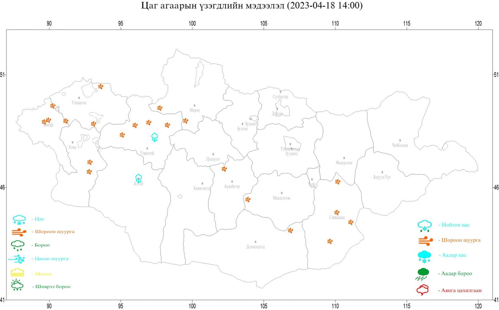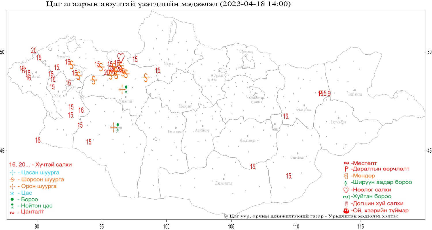 Өнөөдрийн 14:00 цагийн байдлаар Баян-Өлгий аймгийн Өлгий, Ногооннуур, Баяннуур, Сагсай 9-17 м/с, түр зуур 22-26 м/с, Увс аймгийн Өмнөговь, Завхан, Малчин, Өндөрхангай, Наранбулаг, Өлгий, Сагил сумдын нутгаар 11-16 м/с, түр зуур 20-23 м/с, Ховд аймгийн Зэрэг, Чандмань, Мөст, Манхан, Ховд сумдын нутгаар 11-20 м/с, түр зуур 24-28 м/с, Завхан аймгийн ихэнх сумдын нутгаар 6-15 м/с, түр зуур 22-40 м/с хүрч хүчтэй салхилж байна.
