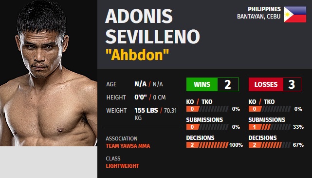 Адонис Севиллено 2 ялж, 3 ялагдсан үзүүлэлттэй. 29 настай. Хамгийн сүүлд өнгөрсөн 12 дугаар сард Филлипиний Дрекс Занбоангад ялагдсан.