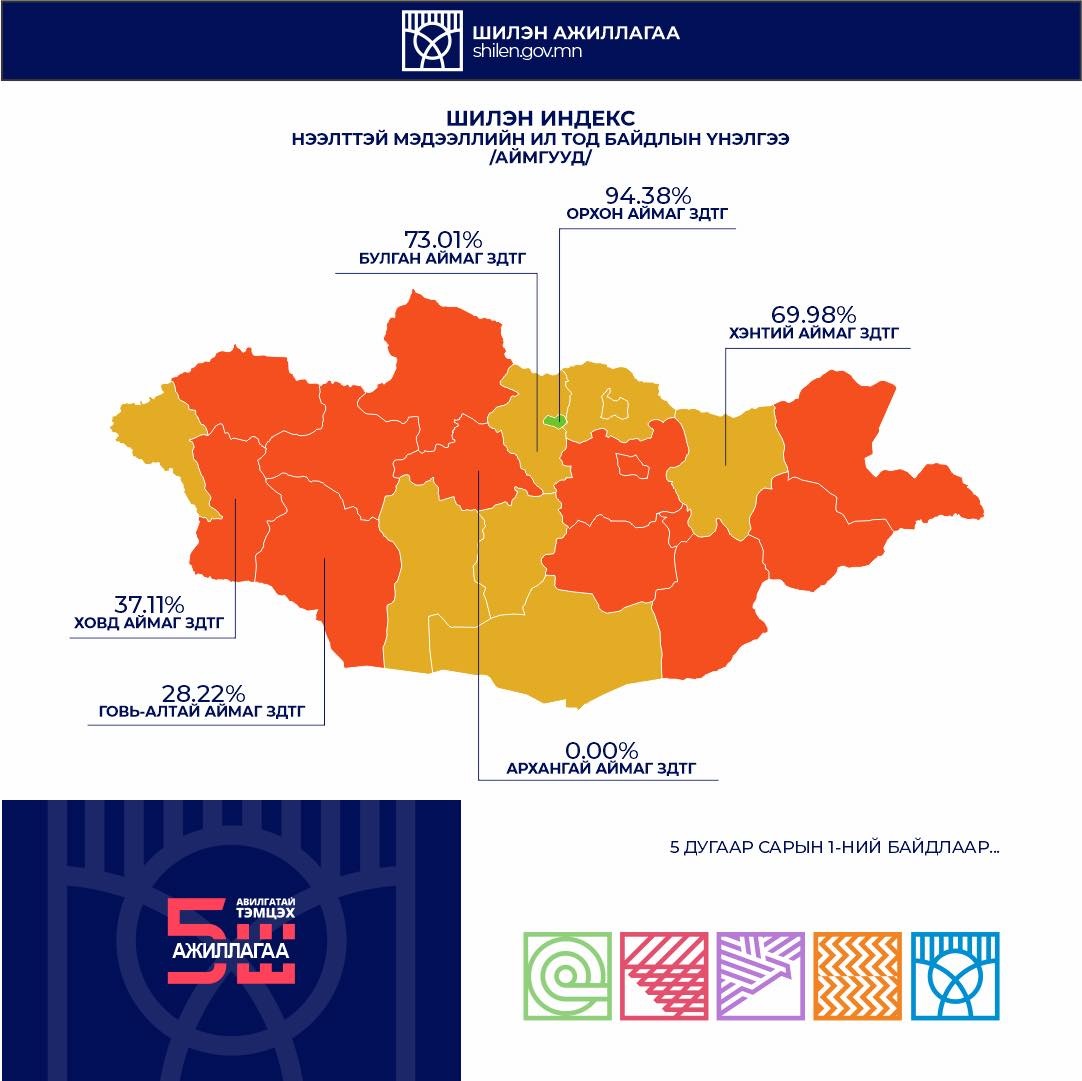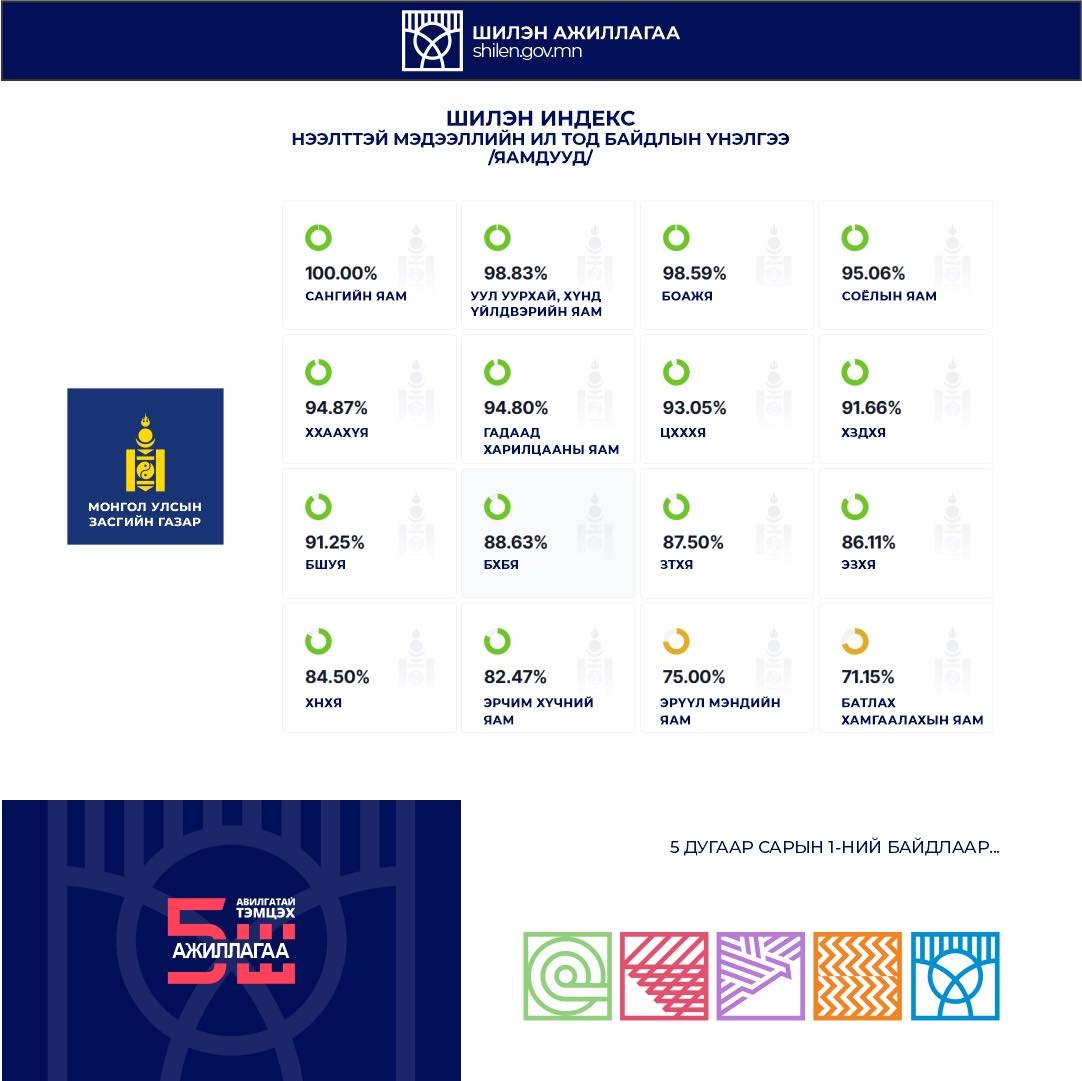 Агентлагуудынх 56.05%-иас 60.43%, аймгийн ЗДТГ-уудын дундаж нь 48.87%-иас 52.53% болж тус тус өсчээ. “Таны төр-Та хяна!” уриатай “Шил” ажиллагаа эхэлсэн 2023 оны гуравдугаар сарын 27-ны өдрөөс хойших хугацаанд shilen.gov.mn-д 32 мянга 417 мөр өгөгдөл байршаад байгаа юм.