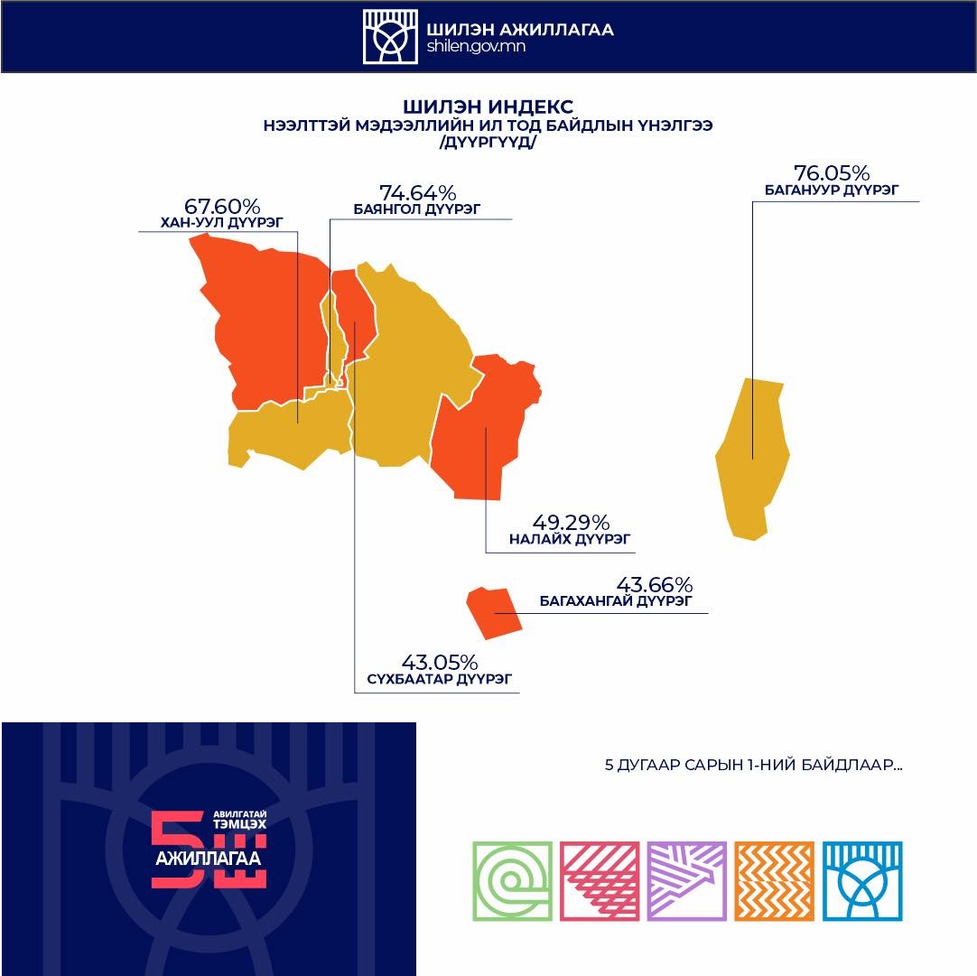 Дүүргүүдийн ил тод байдал яам, агентлагтай харьцуулахад доогуур байгаа бөгөөд Багануур 76.05%, Баянгол дүүрэг 74.64%, Хан-Уул дүүрэг 67.60% -иар тэргүүлсэн байна.
