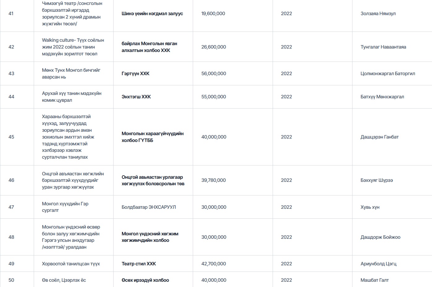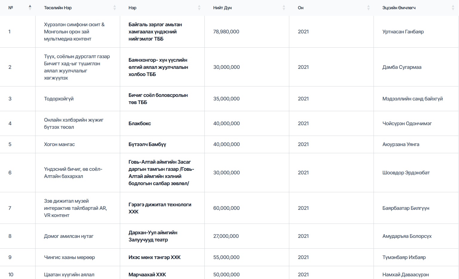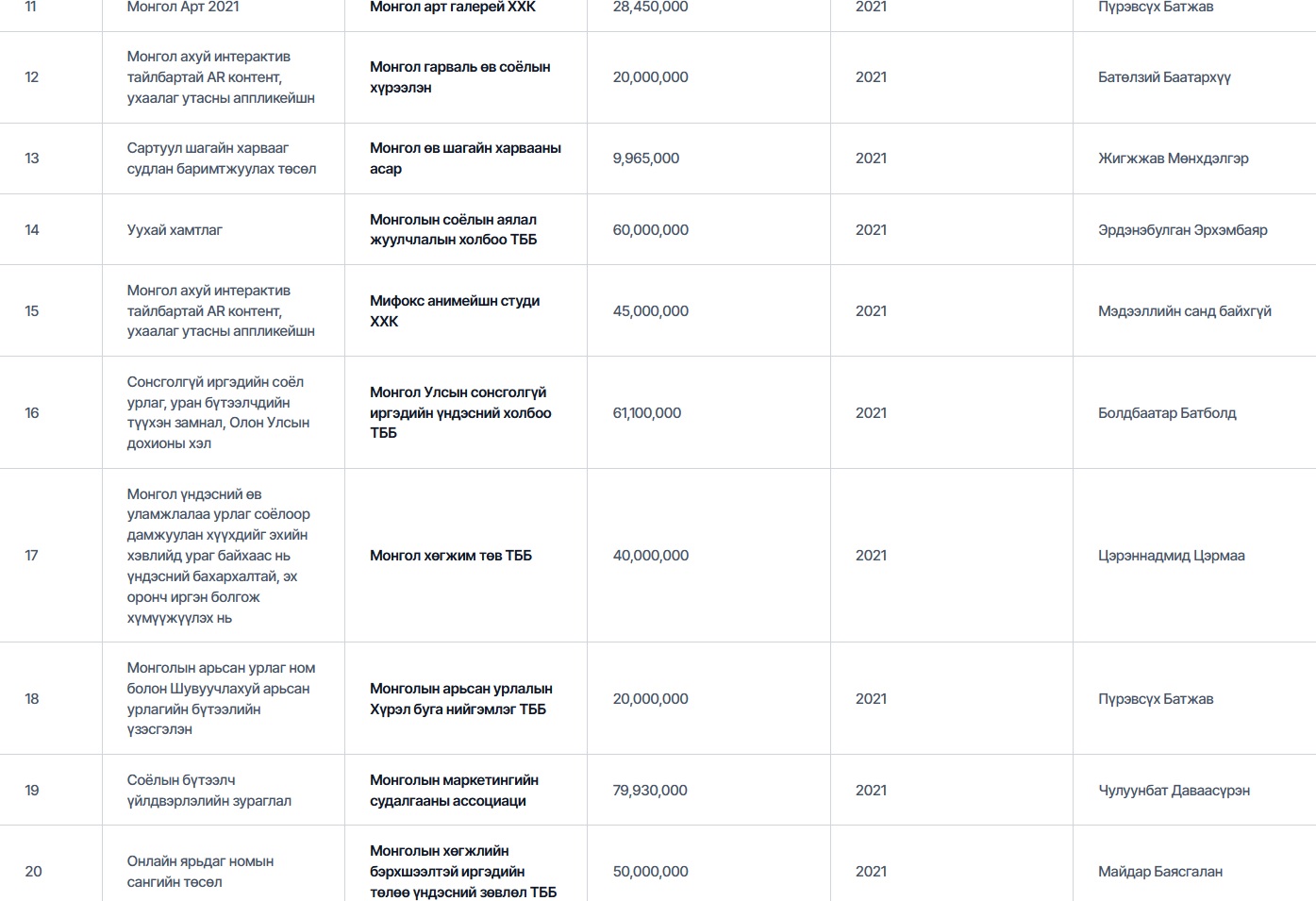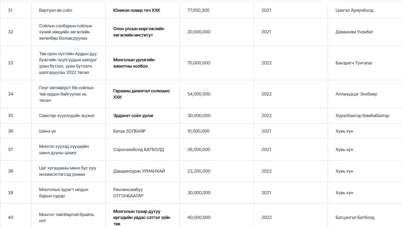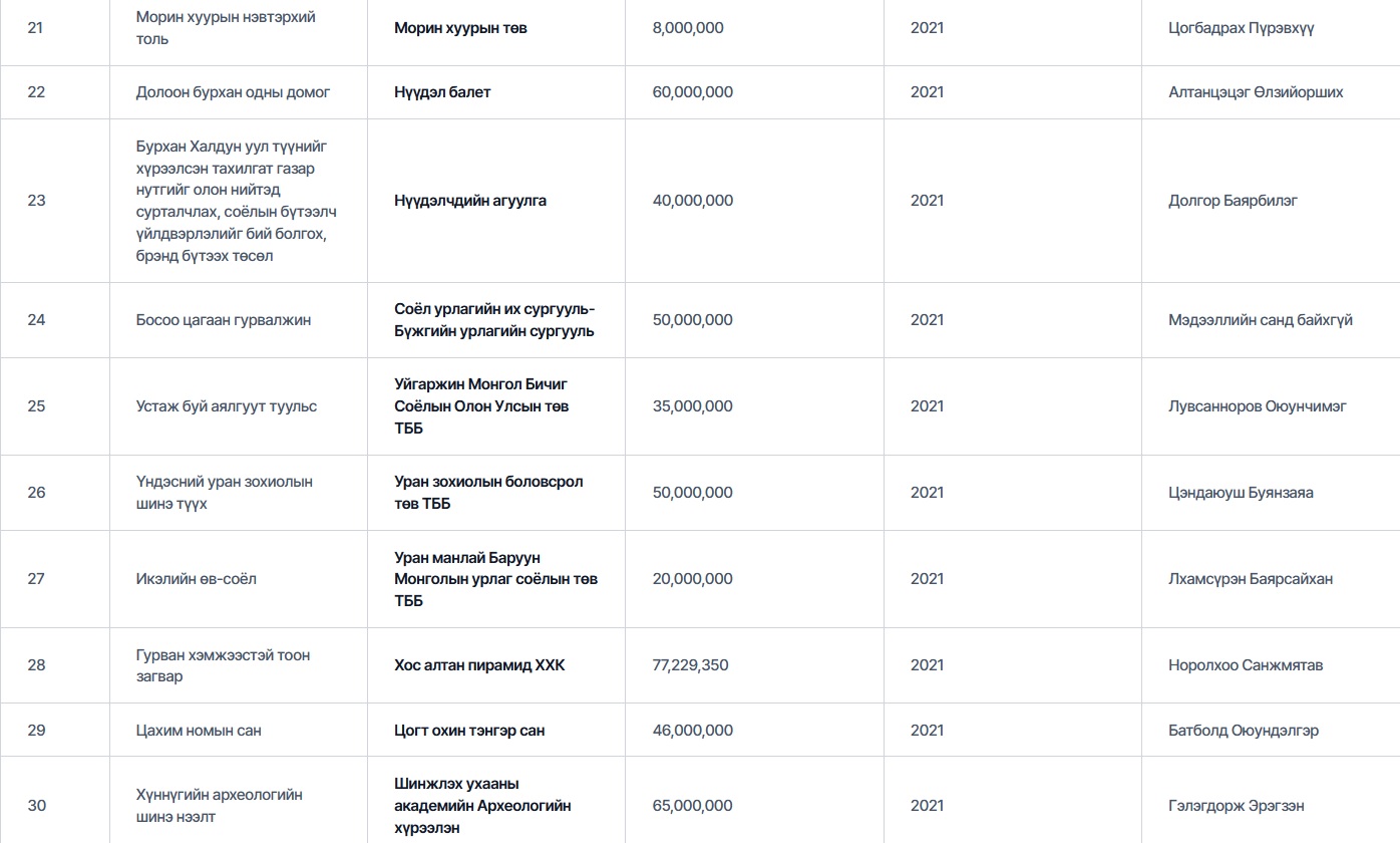 Есдүгээрт Болдбаатар Батболд гэх эцсийн өмчлөгчтэй “Монгол Улсын сонсголгүй иргэдийн үндэсний холбоо” ТББ 2021 онд “Сонсголгүй иргэдийн соёл урлаг, уран бүтээлчдийн түүхэн замнал, Олон улсын дохионы хэл” төслөөр 61,100,000₮ авсан байна. Аравдугаарт, “Нүүдэл балет” 2021 онд “Долоон бурхан одны домог” төслөөр, “Монголын соёлын аялал жуулчлалын холбоо” ТББ “Уухай хамтлаг” төслөөр, “Гэрэгэ дижитал технологи” ХХК нь “Зэв дижитал музей интерактив тайлбартай AR, VR контент”-оор тус тус 60 сая төгрөгийн санхүүжилт авчээ.
