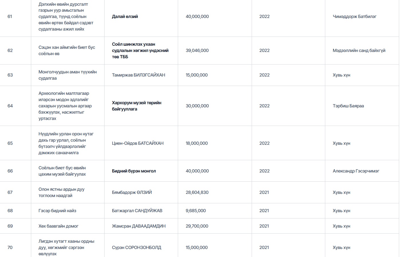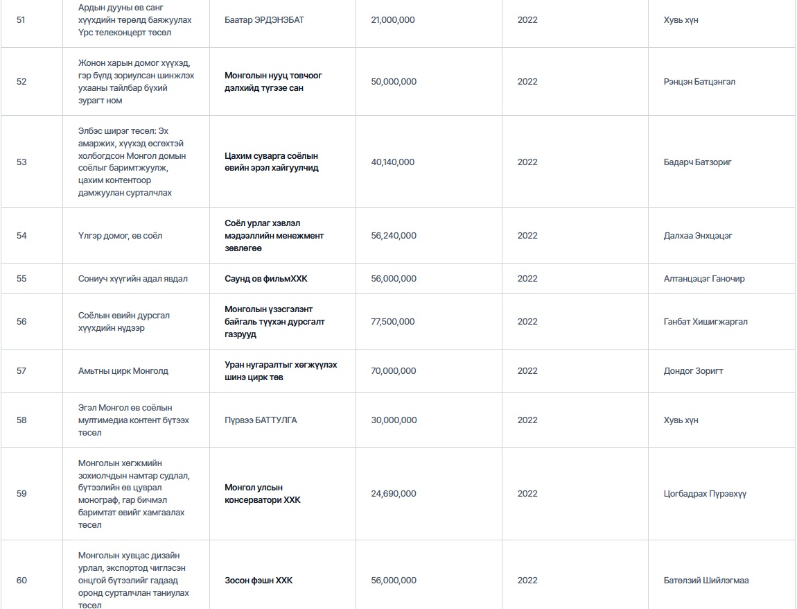 Тухайлбал, өндөр дүнтэй санхүүжилт авсан байгууллагуудаас Чулуунбат Даваасүрэн гэх эцсийн өмчлөгчтэй “Монголын маркетингийн судалгааны ассоциаци” 2021 онд "Соёлын бүтээлч үйлдвэрлэлийн зураглал" төслөөр 79,930,000₮-ийн санхүүжилт авчээ.