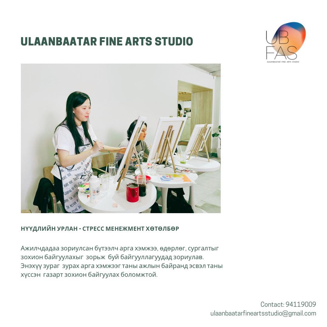 "Нүүдлийн урлан буюу стресс менежмент" хөтөлбөрийн хүрээнд ''Улаанбаатар'' дүрслэх урлагийн студи нь урлагийн боловсрол олгох лекц болон зураг зурах арт арга хэмжээг уран бүтээлч нартай хамтран таны ажлын байранд эсвэл таны хүссэн газарт зохион байгуулах болно.