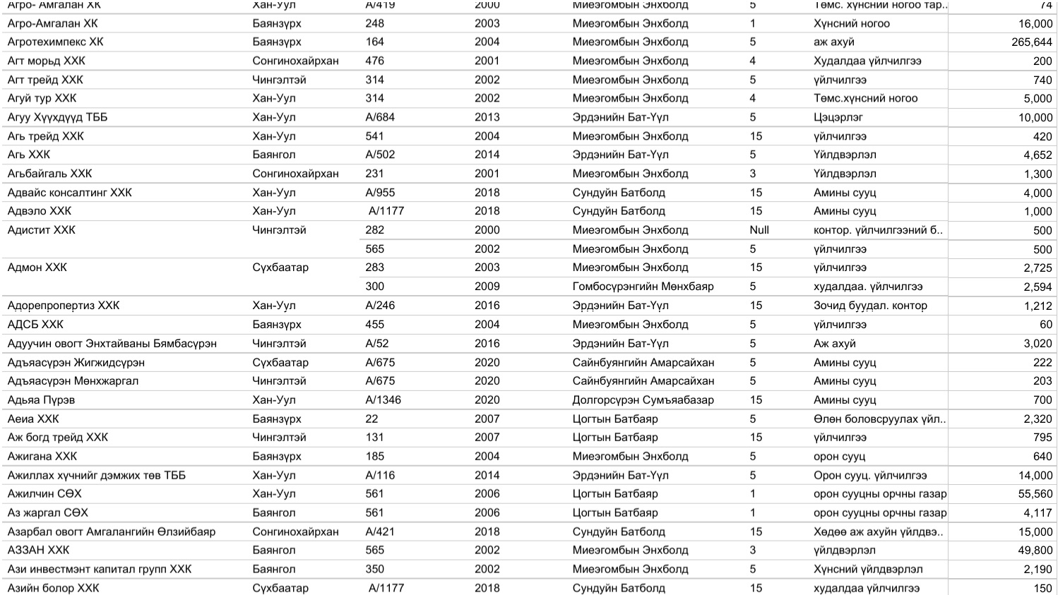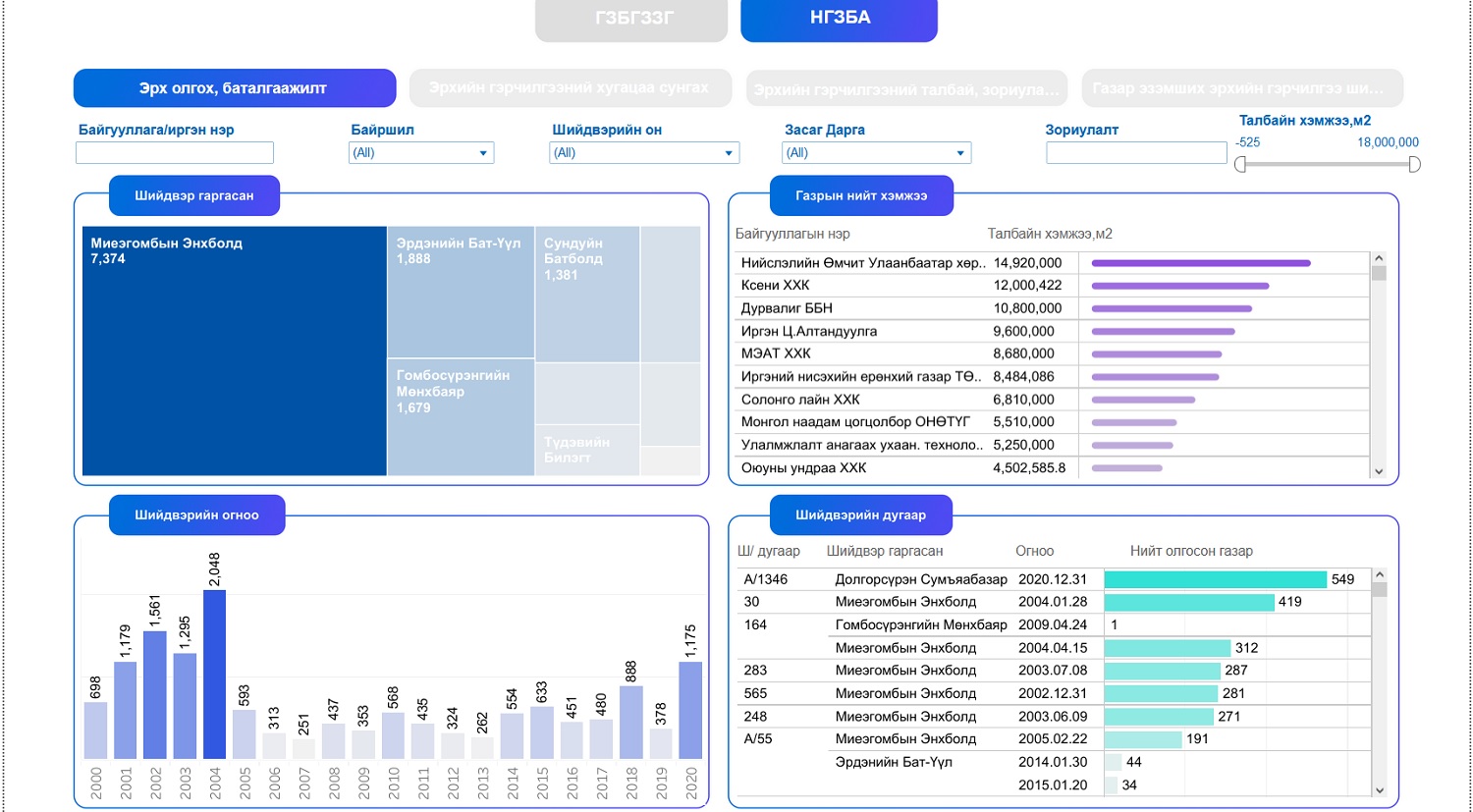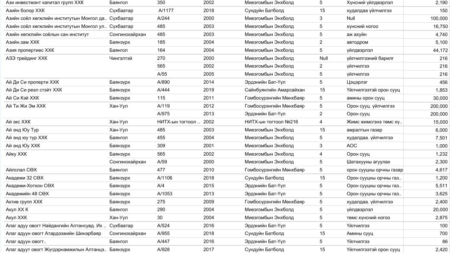 Үүнд Газар эзэмших, ашиглах эрх олгосон 14.954, эрхийн гэрчилгээний талбай, зориулалт өөрчилсөн 6329, эрхийн гэрчилгээг шилжүүлсэн 8525, эрхийн гэрчилгээний хугацааг сунгасан 7150, нийт 36.958 захирамжийг нээлттэйгээр өнөөдөр байршуулж байна.