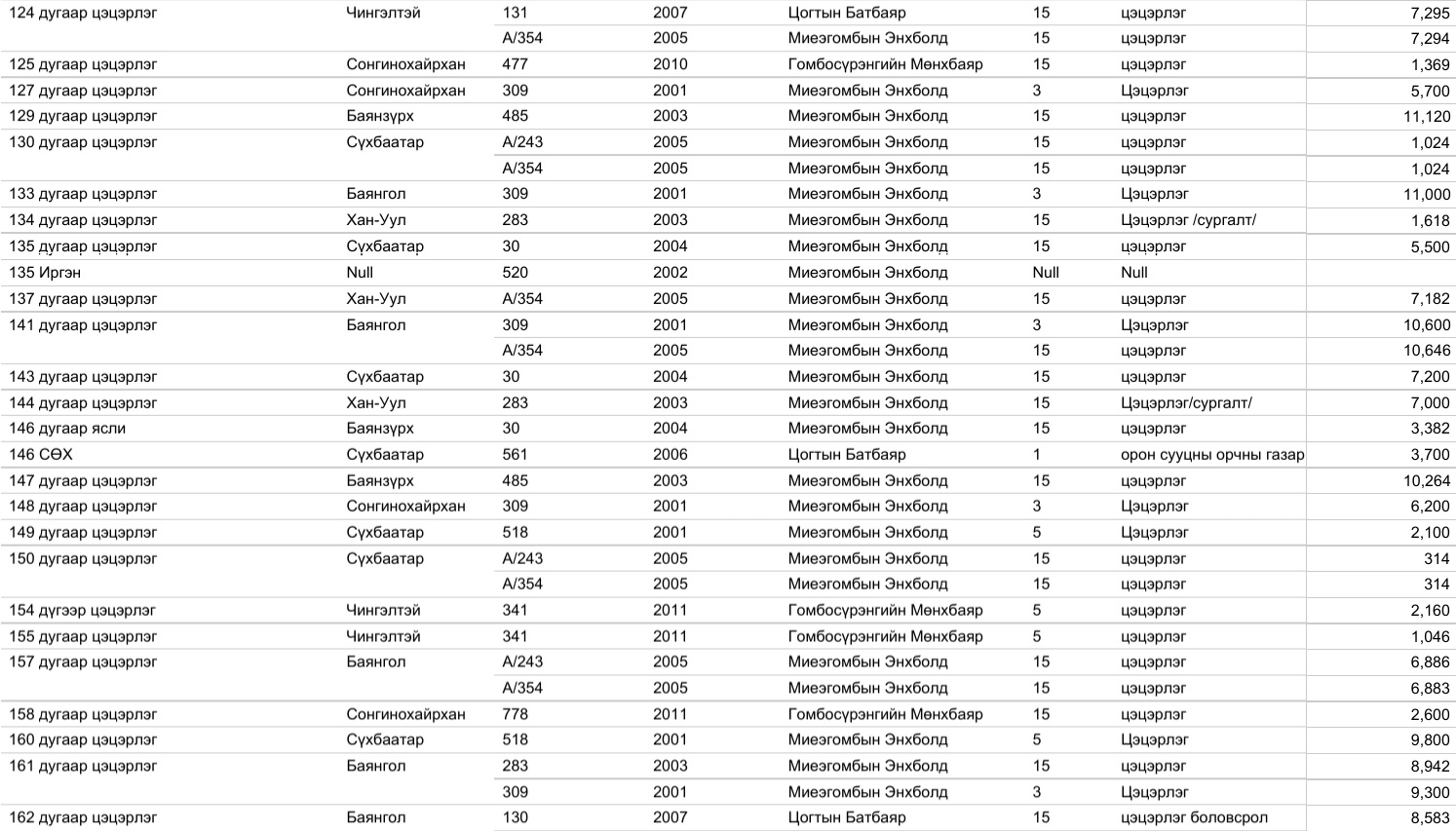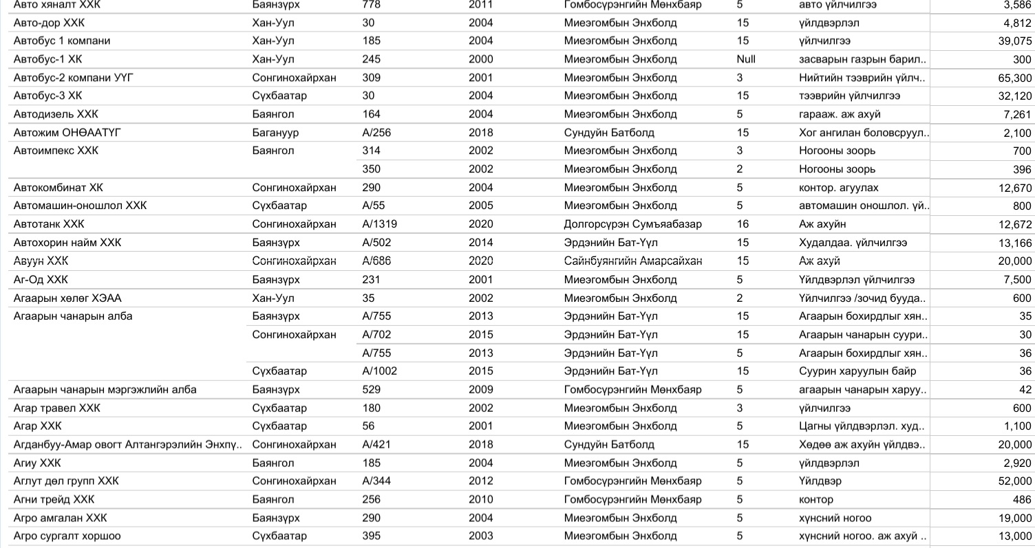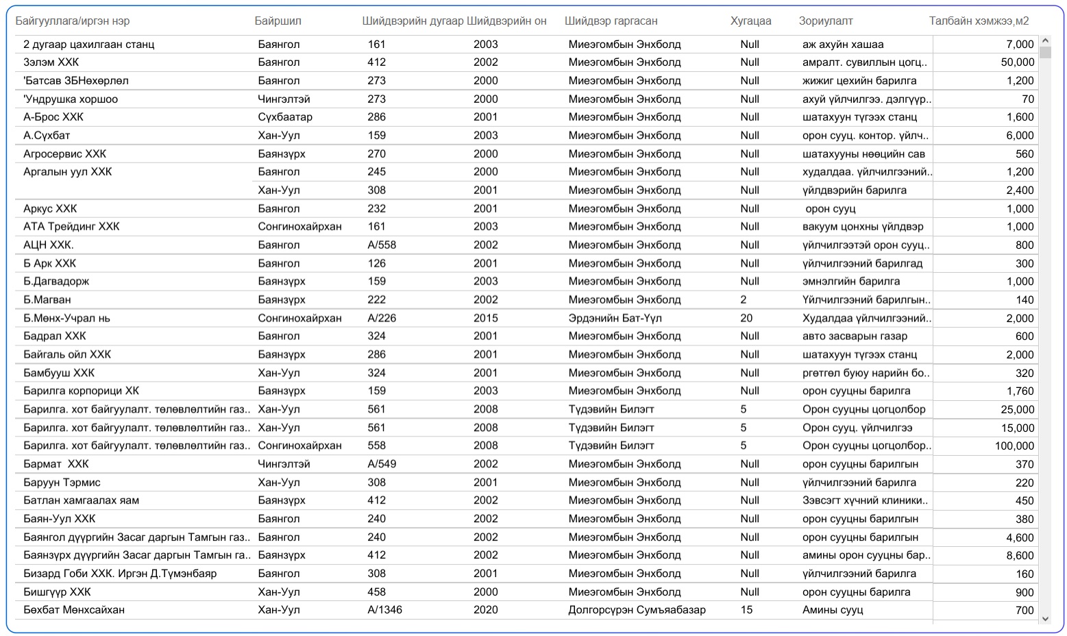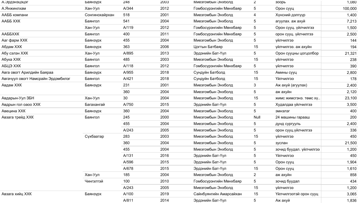 Үүнд Газар эзэмших, ашиглах эрх олгосон 14.954, эрхийн гэрчилгээний талбай, зориулалт өөрчилсөн 6329, эрхийн гэрчилгээг шилжүүлсэн 8525, эрхийн гэрчилгээний хугацааг сунгасан 7150, нийт 36.958 захирамжийг нээлттэйгээр өнөөдөр байршуулж байна.