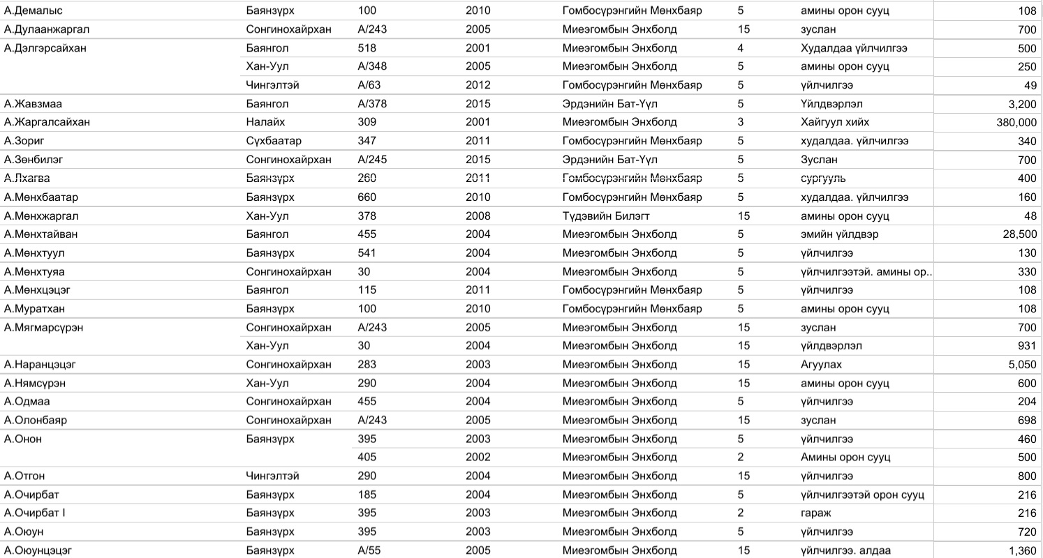 Тэрээр "Мэдээлэл хариуцагч нийслэлийн газрын албаны ирүүлсэн мэдээллийг shilen.gov.mn сайт дээр нэрээр нь, он цагаар нь, зориулалтаар нь, олгосон Засаг дарга, олгуулсан компанитай нь, цааш хэдэн удаа дамжиж өөрчлөгдсөн баримтаар нь ил болгож байна.