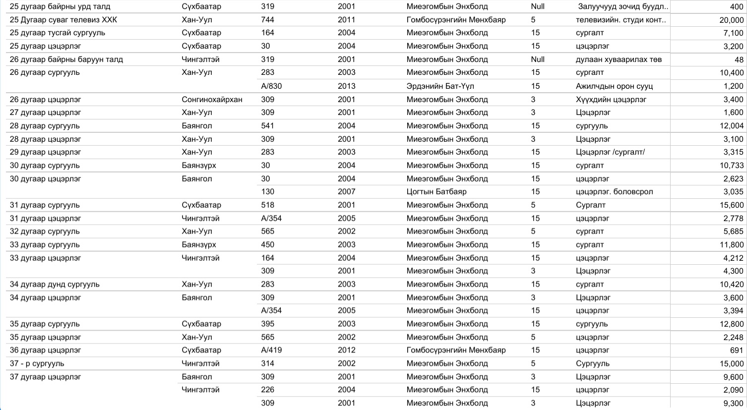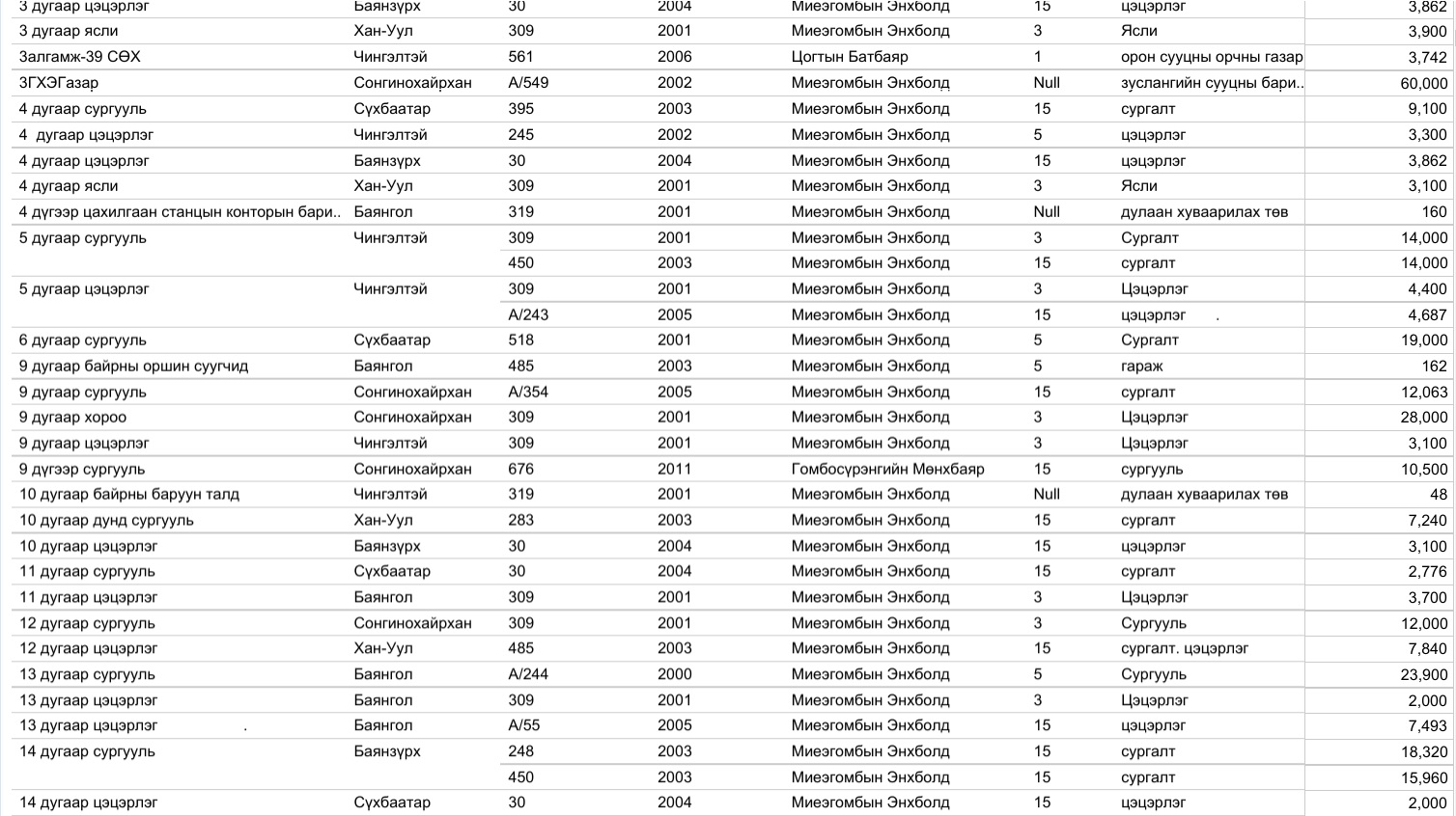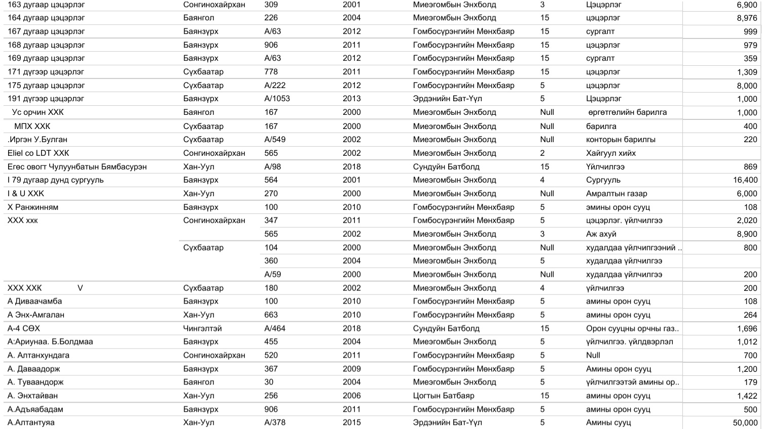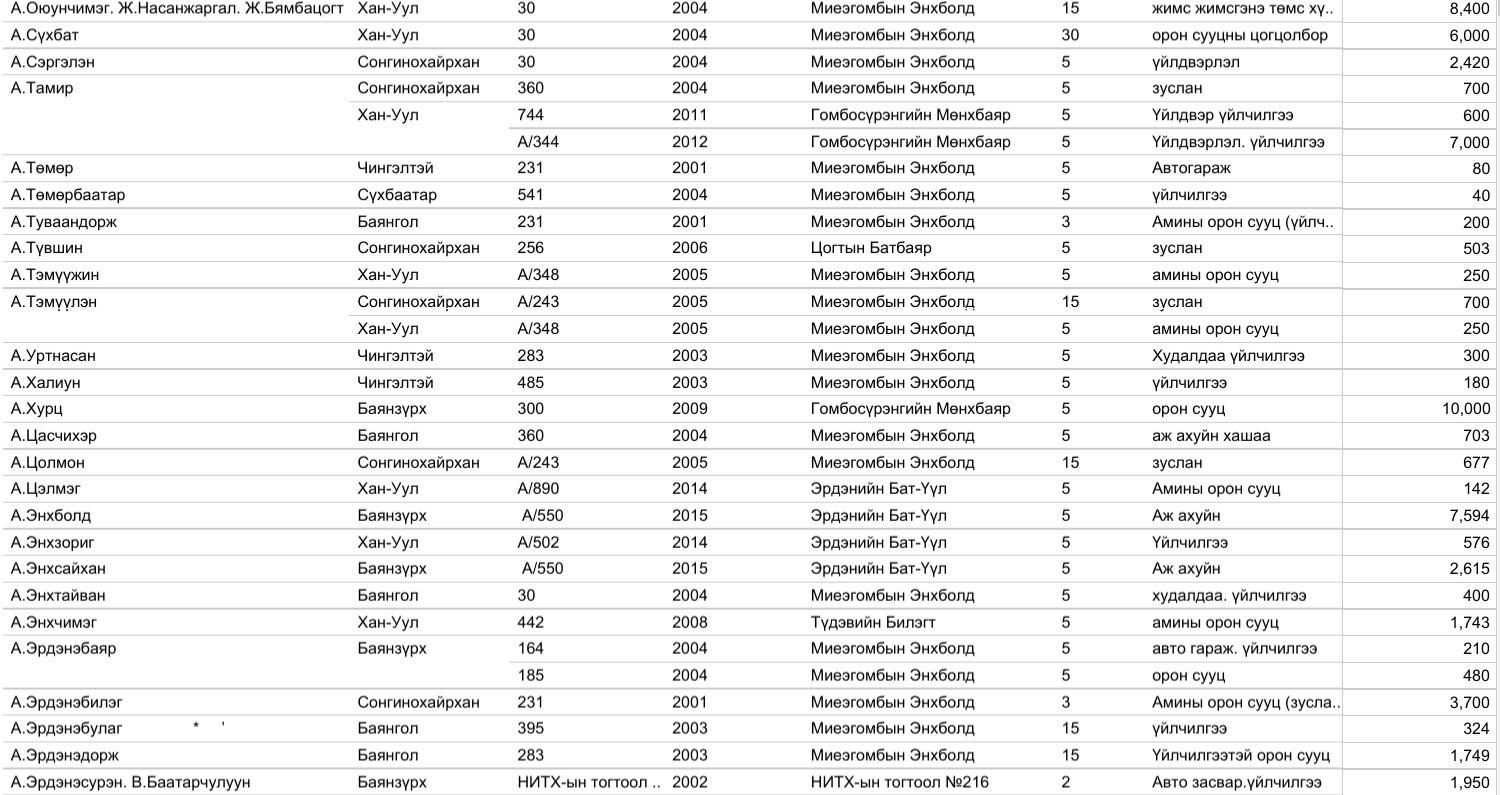 Харин 2020 оны арванхоёрдугаар сарын 31-ээс өнөөдрийг хүртэлх нийслэлийн газар олголтын мэдээллийг, дүүргийн үе үеийн Засаг дарга нарын мэдээлэлтэй нэгтгэж байшуулах ажлыг зургаадугаар сарын 01-ээс өмнө нэмж хийнэ.