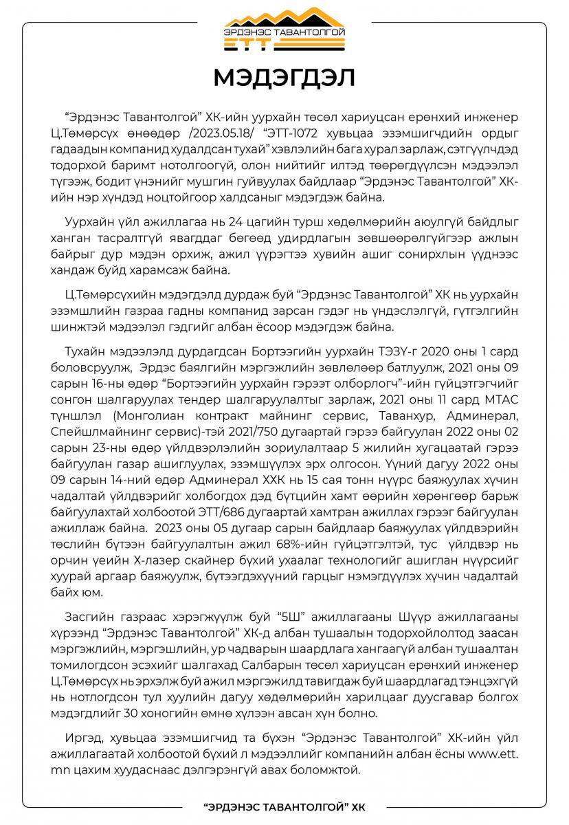 “Эрдэнэс Тавантолгой” ХК-ийн МЭДЭГДЭЛ