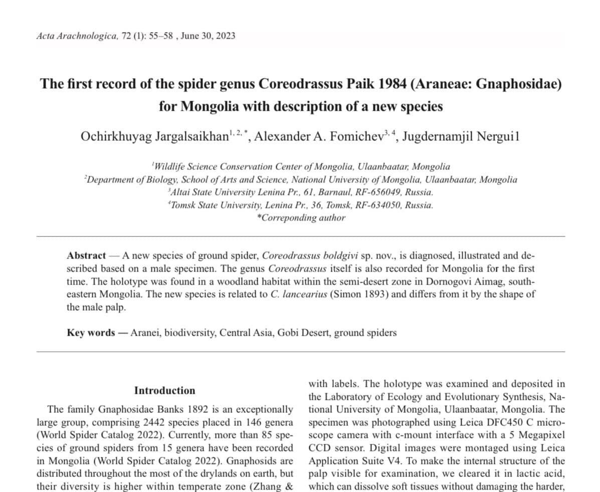 Тодруулбал, "Монгол Улсын зэрлэг амьтан судлах хамгаалах төв"-ийн экологич Ж.Очирхуягийн дэлхийд шинэ зүйлийн аалз нээснийг баталсан “The first record of the spider genus Coreodrassus Paik 1984 (Araneae: Gnaphosidae) for Mongolia with description of a new species” өгүүлэл Acta Arachnologica сэтгүүлд хэвлэгдэхээр болсон байна.