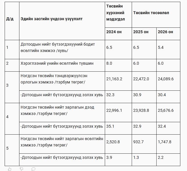 Төсвийн хүрээний мэдэгдэл нь Төсвийн тогтвортой байдлын тухай хуулийн 5.1.3-т зааснаар “Төсвийн бодлогын баримт бичиг” юм. Монгол Улсын нэгдсэн төсвийн 2024 оны төсвийн хүрээний мэдэгдэл, 2025-2026 оны төсвийн төсөөллийн тухай хуулийн төслийг Сангийн сайд Б.Жавхлан УИХ-ын дарга Г.Занданшатарт өргөн бариад буй. Төсвийн хүрээний мэдэгдэлд эдийн засгийн үзүүлэлтүүдийг дараах байдлаар тооцож, тусгасан.