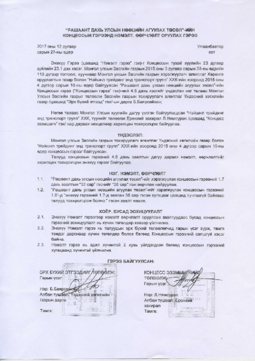 Тухайн үед концессын гэрээг эрх бүхий этгээдээс Хөрөнгө оруулалтын газрын дарга С.Жавхланбаатар болон Үндэсний хөгжлийн газрын дарга Б.Баярсайхан нар, концесс эзэмшигчийн талаас “Нэйшнл трейдинг энд транспорт групп” компанийн захирал Л.Нямсүрэн нар тус тус төлөөлж, гэрээ байгуулжээ. Уг төслийн санхүүжилт нь эхний ээлжинд 55 сая ам.доллар бөгөөд төслийн санхүүжилтийн эхний ээлжийн 12 сая ам.долларыг Монгол Улсын арилжааны аль нэг банкинд байршуулж, төслийн зориулалтын дагуу зарцуулах ёстой ч энэ мөнгөө ч байршуулаагүй алга болжээ. Гэтэл ийм ноцтой хэрэг өдүүлсэн компанид хариуцлага тооцох бүү хэл нэрийг нь ч дурдахгүй байгаагийн цаана юу байна гэдгийг тодруулах учиртай. Тэр тусмаа стратегийн гол нэрийн бүтээгдэхүүн нөөцлөх агуулах барихаар концесс авсан компани асуудалд ямар хандан, хаяж алга болсныг яагаад дурдахгүй байгаа юм. Өнөөгийн Засгийн газар, Цагдаагийн ерөнхий газар, Авлигатай тэмцэх газар, Тагнуулын ерөнхий газар болон бусад холбогдох байгууллагууд яагаад үүнд анхаарал хандуулахгүй байгаа юм.
