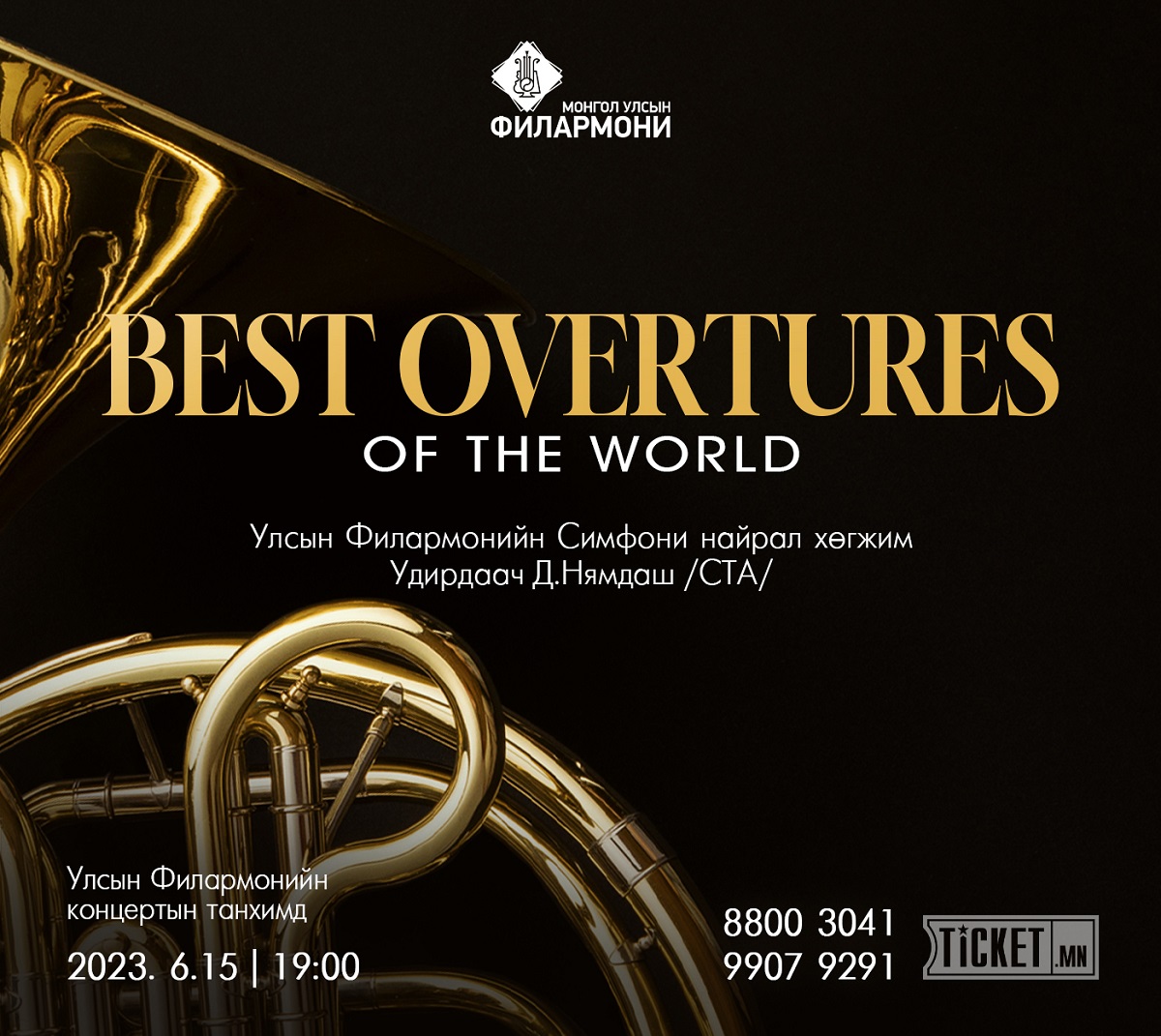 Төрийн шагналт, ардын жүжигчин Ц.Намсрайжавын нэрэмжит Монгол Улсын Филармонийн “Best Overtures Of The World” тоглолтод та бүхнийг хүрэлцэн ирэхийг урьж байна.