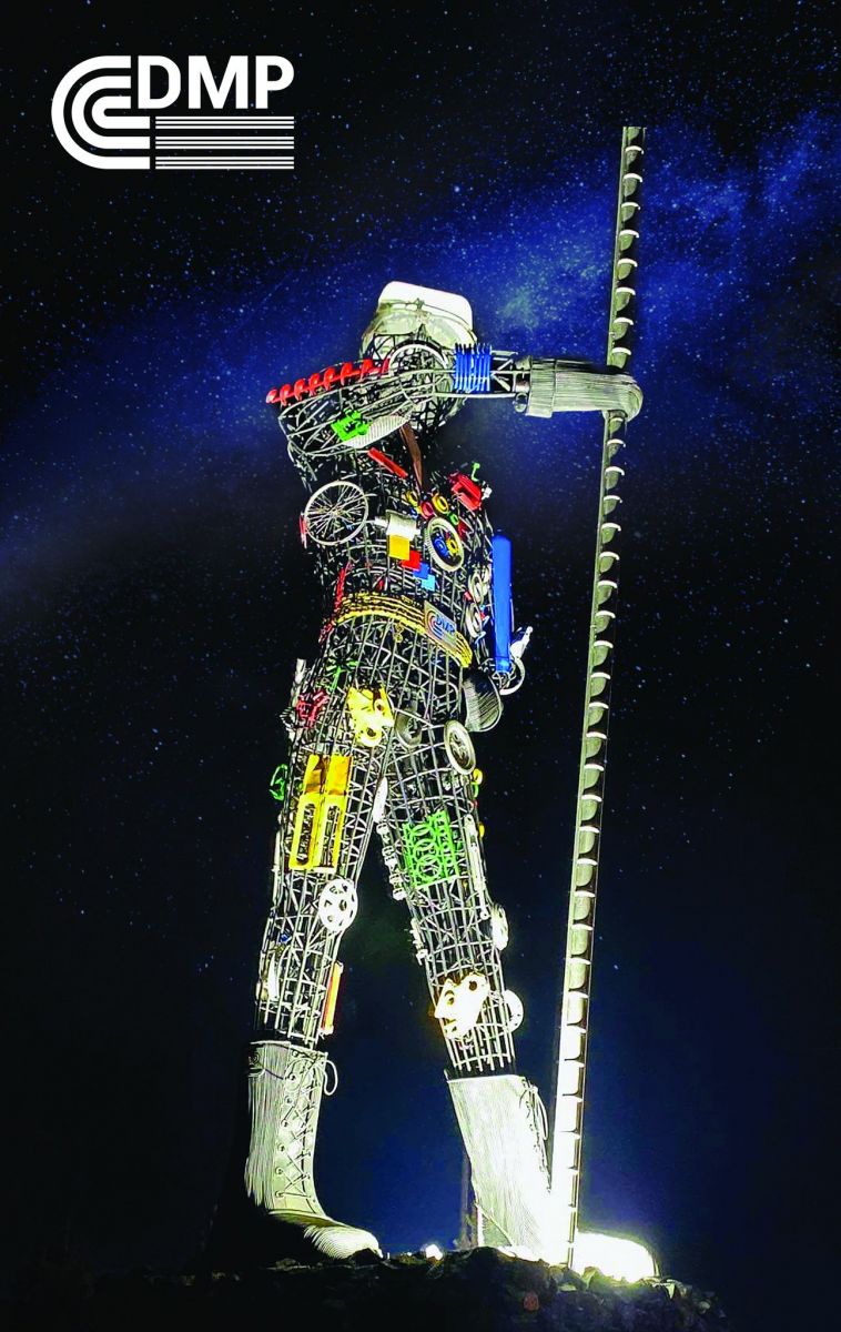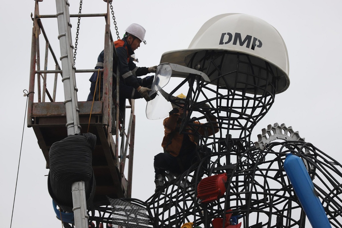 Мөн чих, нүд өвдөг хармаа хэсгүүдэд үйлдвэрлэлийн дамжлагын эд ангиудыг чимэглэл болгон оруулсан байна. Төмөр хүний нийт жин 5,2 тонн бол жижиг том 100 гаруй деталь оржээ.