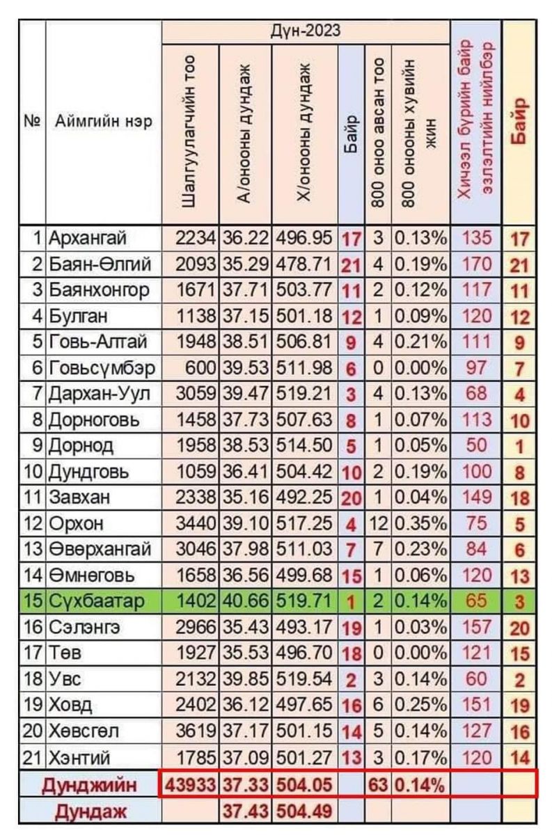 Математикийн хичээлээр 2022 онд 497 оноотой байсан бол 2023 онд 518.4 болж 21 оноогоор өссөн, Физикийн хичээл нь 2022 онд 492 онооноос 2023 онд 520 болж 28 оноогоор өссөн байна. Энэ амжилтад Улсын физикийн 34р олимпиадыг орон нутагтаа зохион байгуулсан нь ихээхэн тус боллоо.