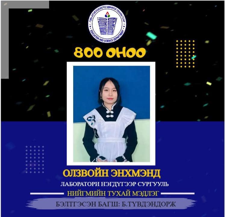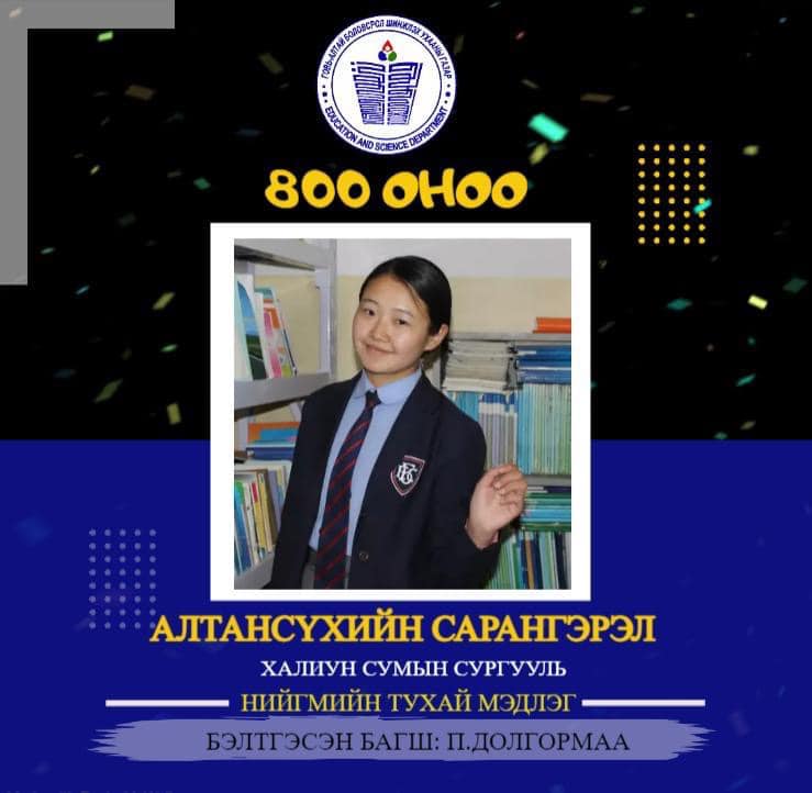НИЙГМИЙН ТУХАЙ МЭДЛЭГ хичээлээр Есөнбулаг сумын лаборатори нэгдүгээр сургуулийн нийгмийн ухааны Б.Түвдэндорж багшийн шавь 12а ангийн сурагч ОЛЗВОЙН ЭНХМЭНД, Халиун сумын ерөнхий боловсролын сургуулийн нийгмийн ухааны П.Долгормаа багшийн шавь 12а ангийн сурагч АЛТСАНСҮХИЙН САРАНГЭРЭЛ улсдаа тэргүүлж 800 оноо авлаа.