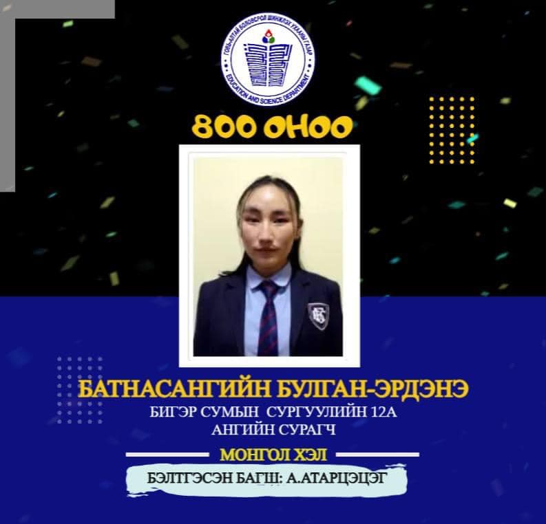 МОНГОЛ ХЭЛ хичээлээр Бигэр сумын ерөнхий боловсролын сургуулийн А.Атарцэцэг багшийн шавь 12а ангийн сурагч БАТНАСАНГИЙН БУЛГАН-ЭРДЭНЭ улсдаа тэргүүлж 800 оноо авлаа.