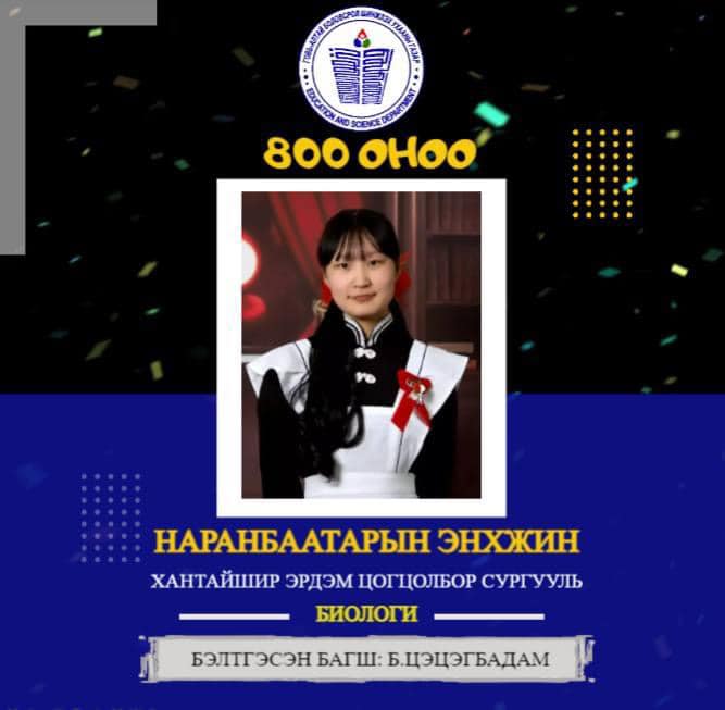 БИОЛОГИ хичээлээр Хантайшир-Эрдэм цогцолбор сургуулийн Б.Цэцэгбадам багшийн шавь 12а ангийн сурагч НАРАНБААТАРЫН ЭНХЖИН улсдаа тэргүүлж 800 оноо авлаа.