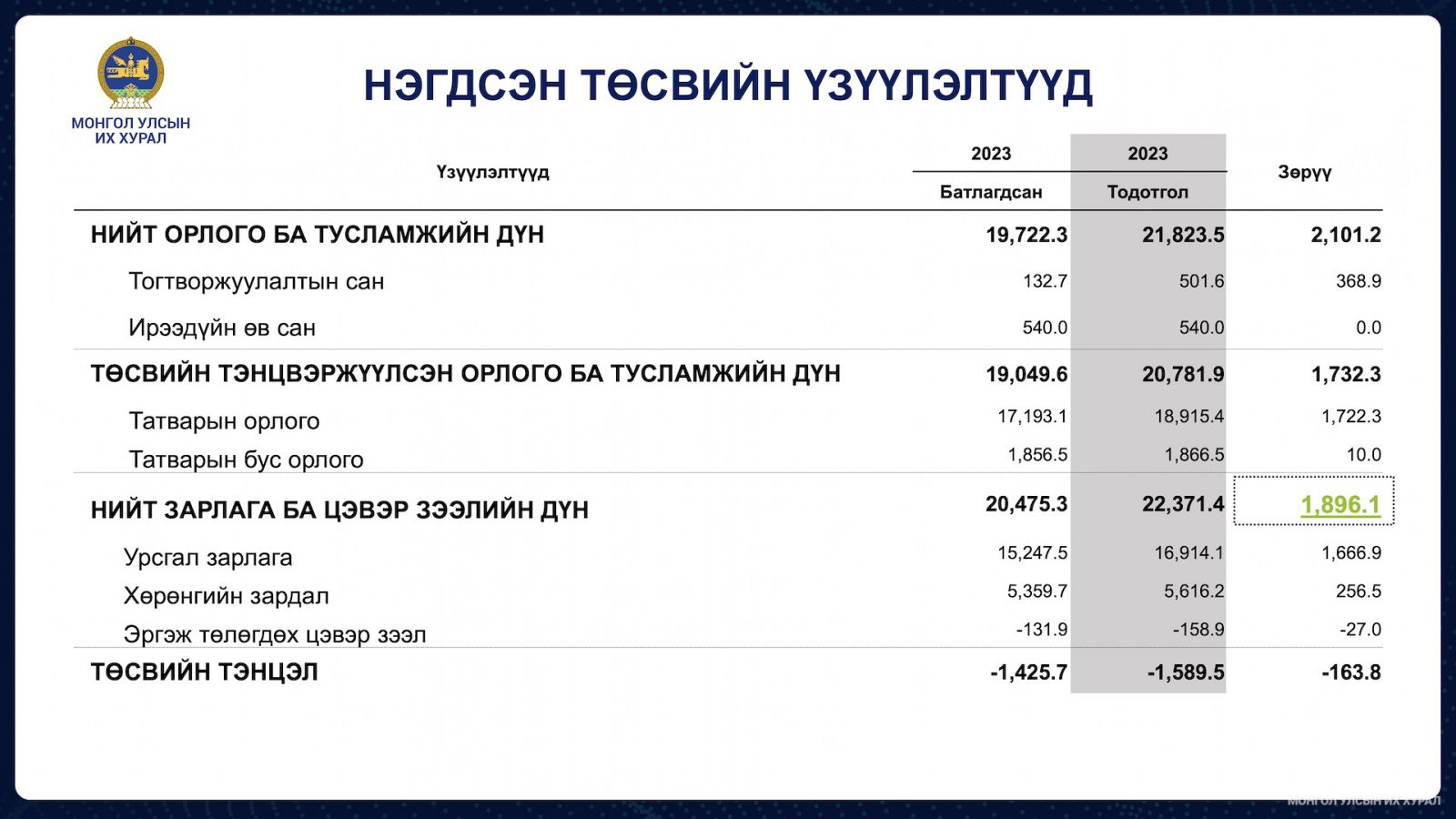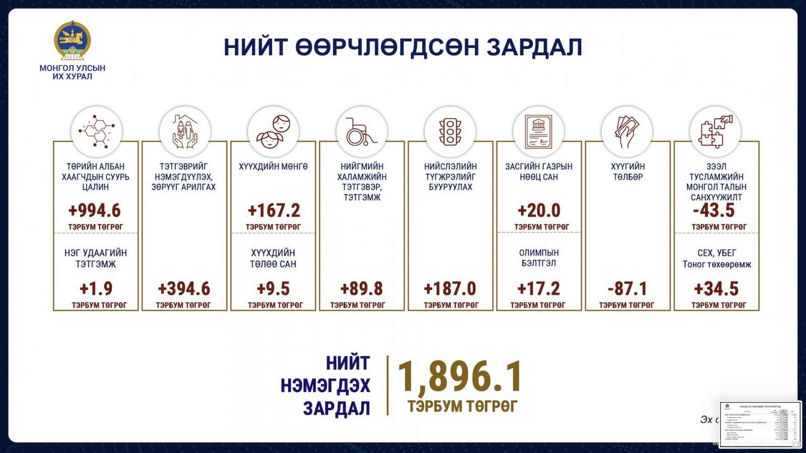 Тухайлбал, төрийн албан хаагчдын цалингийн тогтолцоог өөрчилсөн. Сүүлийн 20 гаруй жилийн хугацаанд 30 гаруй хуулиар цалингийн зохицуулалтуудыг хийж ирснийг өөрчлөх шаардлагатай болсон. Төрийн албан хаагчдын нэмэгдэл 104 хуулиар зохицуулагдаж байгааг цаашдаа зөвхөн Төрийн албаны тухай хуулиар шийдвэрлэдэг байх, нэгдсэн нэг бодлоготой байх зохицуулалт төсвийн тодотголын хүрээнд хийгдсэн гэж танилцуулав. Үргэлжлүүлэн цаашдаа цалин болон тэтгэвэр инфляцын түвшинтэй уялдаад нэмэгддэг байх суурь шинэчлэл хийгдэж байна. Монгол Улсад 225 мянган төрийн албан хаагч байгаагийн 217 мянган төрийн албан хаагч нь цалингийн нэмэгдлийн хүрээнд хамрагдах болно гэв. Түүнчлэн Төсвийн тодотголыг дагаж 7 хууль, 2 тогтоолын төсөлд нэмэлт өөрчлөлт оруулж баталсан талаар танилцууллаа.