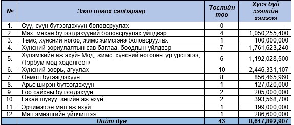 Засгийн газрын 2020 оны 113 дугаар тогтоолоор батлагдсан “Жижиг, дунд үйлдвэрийг хөгжүүлэх сангаас хөнгөлөлттэй зээл олгох, сонгон шалгаруулах, дамжуулан зээлдүүлэх, эргэн төлүүлэх, хяналт тавих журам” болон ХХААХҮ-ийн Сайдын 2023 оны 02 дугаар сарын 02-ны өдрийн А/37 дугаар тушаалаар батлагдсан хөнгөлөлттэй зээл олгох Ерөнхий нөхцөл, салбар, чиглэлийн дагуу жижиг, дунд үйлдвэр, үйлчилгээ эрхлэгчийн төслийг хүлээн авах үйл ажиллагааг 2023 оны хоёрдугаар сарын 09-өөс 2023 оны гуравдугаар сарын 10-ны 24:00 цаг хүртэл 30 хоногийн хугацаанд хүлээн авч, цахим системд нийт 96,7 тэрбум төгрөгийн зээлийн хүсэлт бүхий 655 аж ахуйн нэгж төслөө баталгаажуулсан байна.