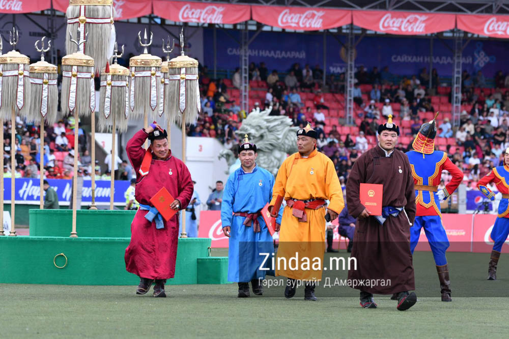 Монгол Улсын Ерөнхийлөгч Ухнаагийн Хүрэлсүх өнөөдөр зарлиг гаргаж, Тулгар төрийн 2232 жил, Их Монгол Улс байгуулагдсаны 817 жил, Үндэсний эрх чөлөө, тусгаар тогтнолоо сэргээн мандуулсны 112 жил, Ардын хувьсгалын 102 жил жилийн ой, Улсын баяр наадмын Үндэсний бөхийн барилдаанд тав давж “Улсын начин” цол, зургаа давж “Улсын харцага” цолны болзол хангасан бөхчүүдэд цол олголоо.