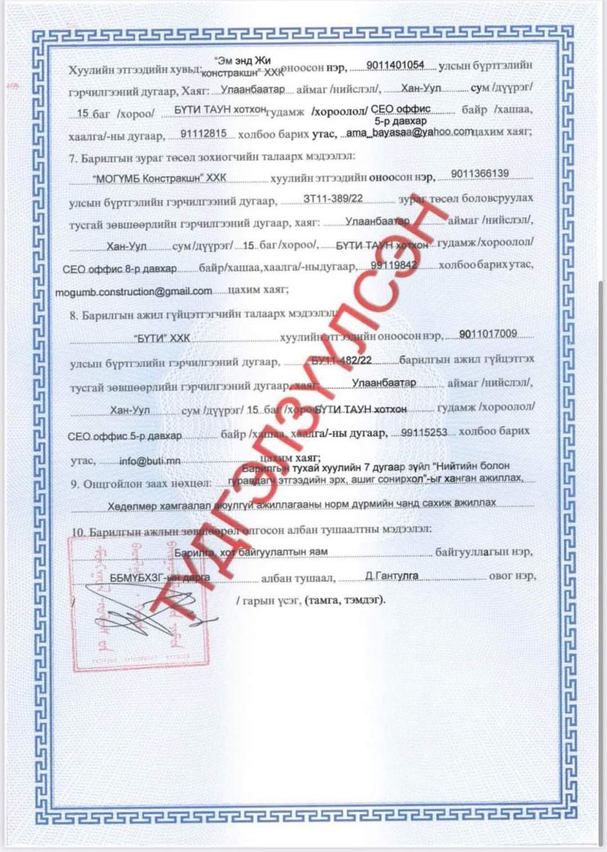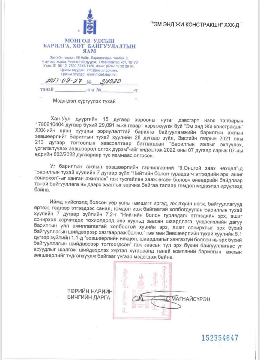 Тэрбээр "Авлига хороолол гэж нэрлэгдээд буй "Эм энд Жи констракшн" ХХК-ийн барилгын ажлын зөвшөөрлийг түтгэлзүүлэх шийдвэрийг яамнаас гаргаж, барилгын ажлыг зогсоохоор болсон" гэж олон нийтийн сүлжээнд нийтэлсэн юм.