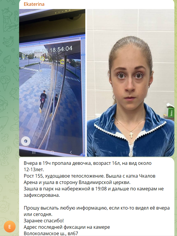 Гэнэт сүлжээнд “Үдэш 19:00 цагт 16 настай охин сураггүй алга боллоо. 12-13 настай мэт харагддаг. 155 см өндөр, туранхай. “Чкалов Арена” мөсөн талбайнаас гараад Владимир сүмийн зүг явсан. Далайн эргийн хүрээлэнд 19.08 цагт орж байгаа нь бичлэгт харагдсан. Ингээд сураггүй алга боллоо. Түүнийг харсан хүн холбоо барина уу” гэж Екатерина хэмээх эмэгтэй бичсэн нь ээж нь байв. Түүнд дасгалжуулагч багш Софья Федченко утасдаж, охин нь бэлтгэл тараад хариагүй талаар хэлсэн гэнэ.