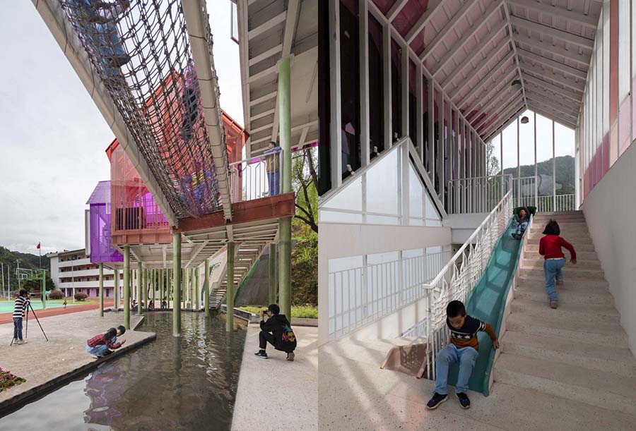 Хотжилт Хятадын хөдөөгийн сургуулиудад асар их нөлөө үзүүлж байна. Энэ бага сургуулийг ч тойрсонгүй. Хуучирч, багшийн дутагдалд орсон тус бага сургуулийн шинэ барилгын загварыг гаргахдаа байгаль орчных нь онцлогийг тусгажээ. Шат, дүүжин гүүр, хонгил зэрэг нь уулын замыг санагдуулна. Хулсан ой, жимсний мод, ойн цэцэгс, жижиг хэмжээний усан сантай холбогдож, уулархаг бүсийн жижиг тосгодын гайхамшигт ертөнцийг бүрдүүлжээ.