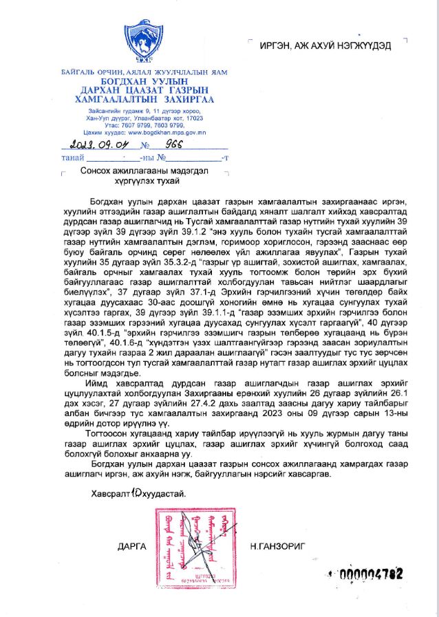 Иймд хавсралтад дурдсан газар ашиглагчдын газар ашиглах эрхийг цуцлуулахтай холбогдуулан Захиргааны ерөнхий хуулийн 26 дугаар зүйлийн 26.1 дэх хэсэг, 27 дугаар зүйлийн 27.4.2 дахь заалтад заасны дагуу хариу тайлбарыг албан бичгээр тус хамгаалалтын захиргаанд 2023 оны 09 дүгээр сарын 13-ны өдрийн дотор ирүүлнэ үү!