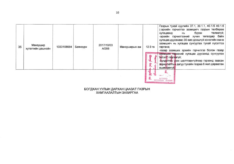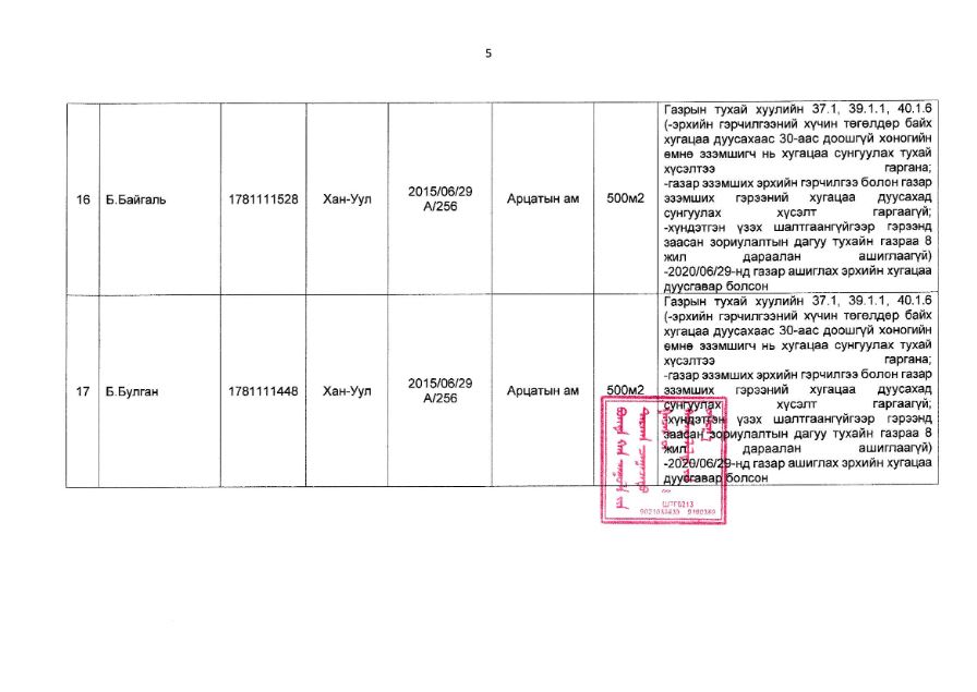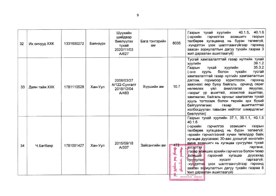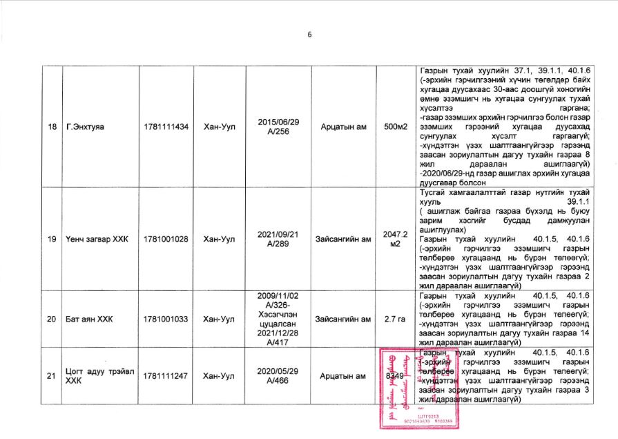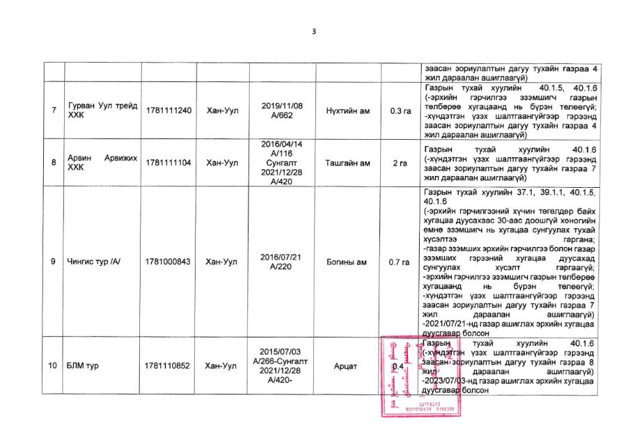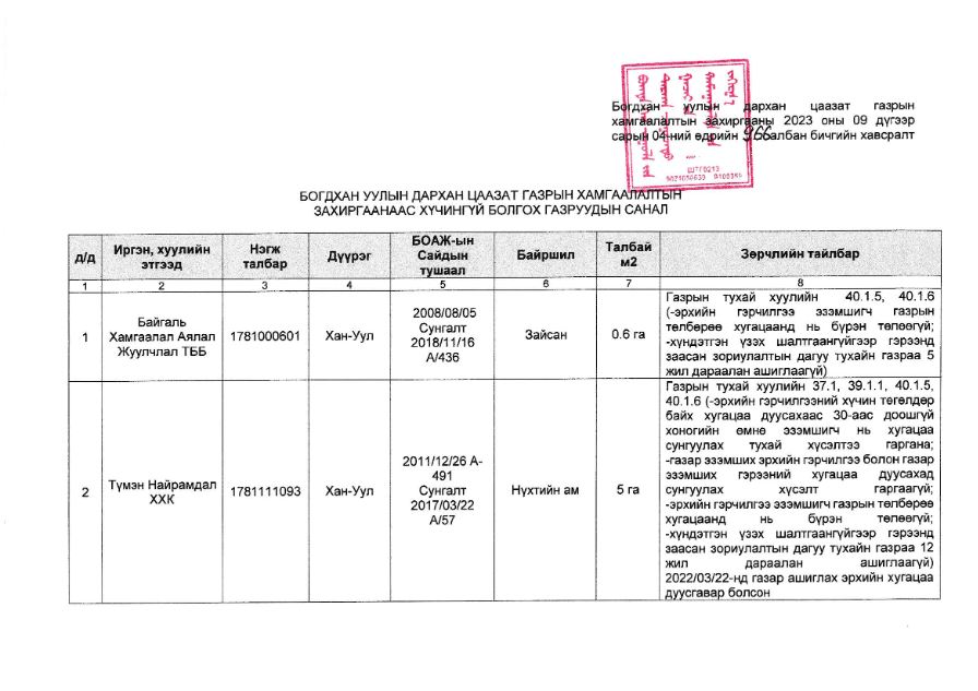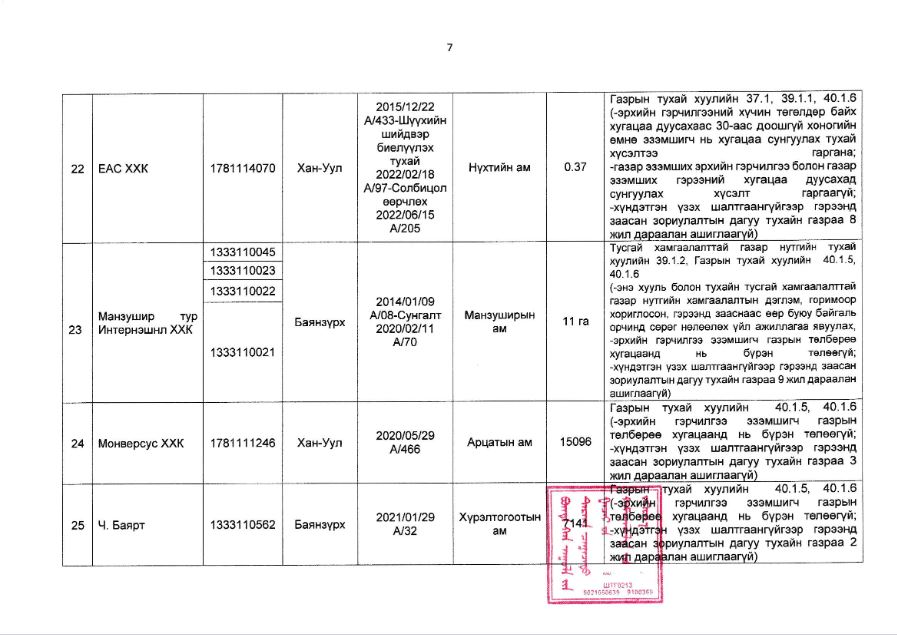 Богдхан уулын дархан цаазат газрын хамгаалалтын захиргаанаас иргэн, хуулийн этгээдийн газар ашиглалтын байдалд хяналт шалгалт хийхэд хавсралтад дурдсан газар ашиглагчид нь Тусгай хамгаалалттай газар нутгийн тухай хуулийн 39 дүгээр зүйл 39 дүгээр зүйл 39.1.2 “энэ хууль болон тухайн тусгай хамгаалалттай газар нутгийн хамгаалалтын дэглэм, горимоор хориглосон, гэрээнд зааснаас өөр буюу байгаль орчинд сөрөг нөлөөлөх үйл ажиллагаа явуулах”, Газрын тухай хуулийн 35 дугаар зүйл 35.3.2-д “газрыг үр ашигтай, зохистой ашиглах, хамгаалах, байгаль орчныг хамгаалах тухай хууль тогтоомж болон төрийн эрх бүхий байгууллагаас газар ашиглалттай холбогдуулан тавьсан нийтлэг шаардлагыг биелүүлэх”, 37 дугаар зүйл 37.1-д Эрхийн гэрчилгээний хүчин төгөлдөр байх хугацаа дуусахаас 30-аас доошгүй хоногийн өмнө нь хугацаа сунгуулах тухай хүсэлтээ гаргах, 39 дүгээр зүйл 39.1.1-д “газар эзэмших эрхийн гэрчилгээ болон газар эзэмших гэрээний хугацаа дуусахад сунгуулах хүсэлт гаргаагүй”, 40 дүгээр зүйл 40.1.5-д “эрхийн гэрчилгээ эзэмшигч газрын төлбөрөө хугацаанд нь бүрэн төлөөгүй”, 40.1.6-д “хүндэтгэн үзэх шалтгаангүйгээр гэрээнд заасан зориулалтын дагуу тухайн газраа 2 жил дараалан ашиглаагүй” гэсэн заалтуудыг тус тус зөрчсөн нь тогтоогдсон тул тусгай хамгаалалттай газар нутагт газар ашиглах эрхийг цуцлах болсныг мэдэгдье.