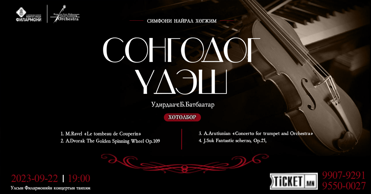 Сонгодог хөгжмийг мэдрэх гайхамшигт үдэш: 2023 оны 09 сарын 22-нд 19:00 цагаас Улсын Филармонийн концертын танхимд та бүхнийг хүрэлцэн ирэхийг урьж байна.