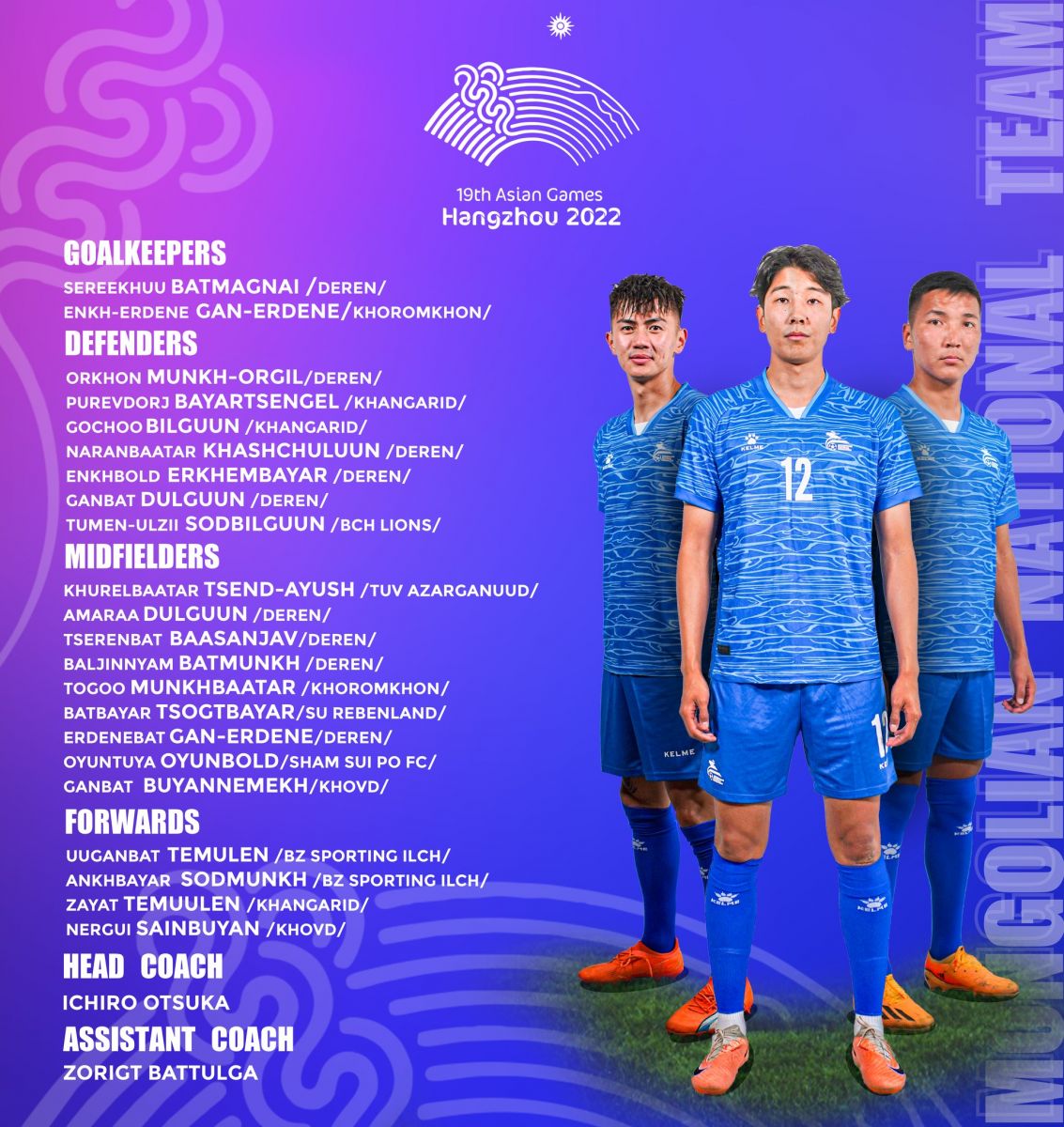 Монголын хөлбөмбөгийн холбооноос тус наадамд оролцох хөлбөмбөгийн төрлийн эрэгтэйчүүдийн шигшээ багийн бүрэлдэхүүнийг албан ёсоор зарлалаа. Манай эрэгтэй баг "B" хэсэгт Вьетнам, Саудын Араб, Ираны шигшээ багуудтай өрсөлдөнө.