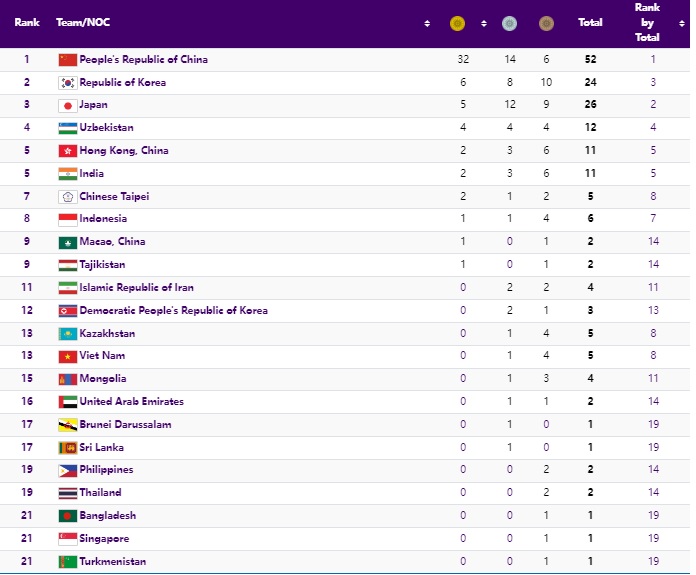 Одоогийн байдлаар Ханжоуд Хятадын шигшээ 32 алтан медальтай, нийт 52 медальтай тасархай тэргүүлж байна. Монголын шигшээ баг 1 мөнгө, 3 хүрэл медальтай 15-д жагсаж байна. Манай яг доор бичигдсэн АНЭУ хоёр медальтайг хоёуланг нь манай жүдочид авч өгчээ.