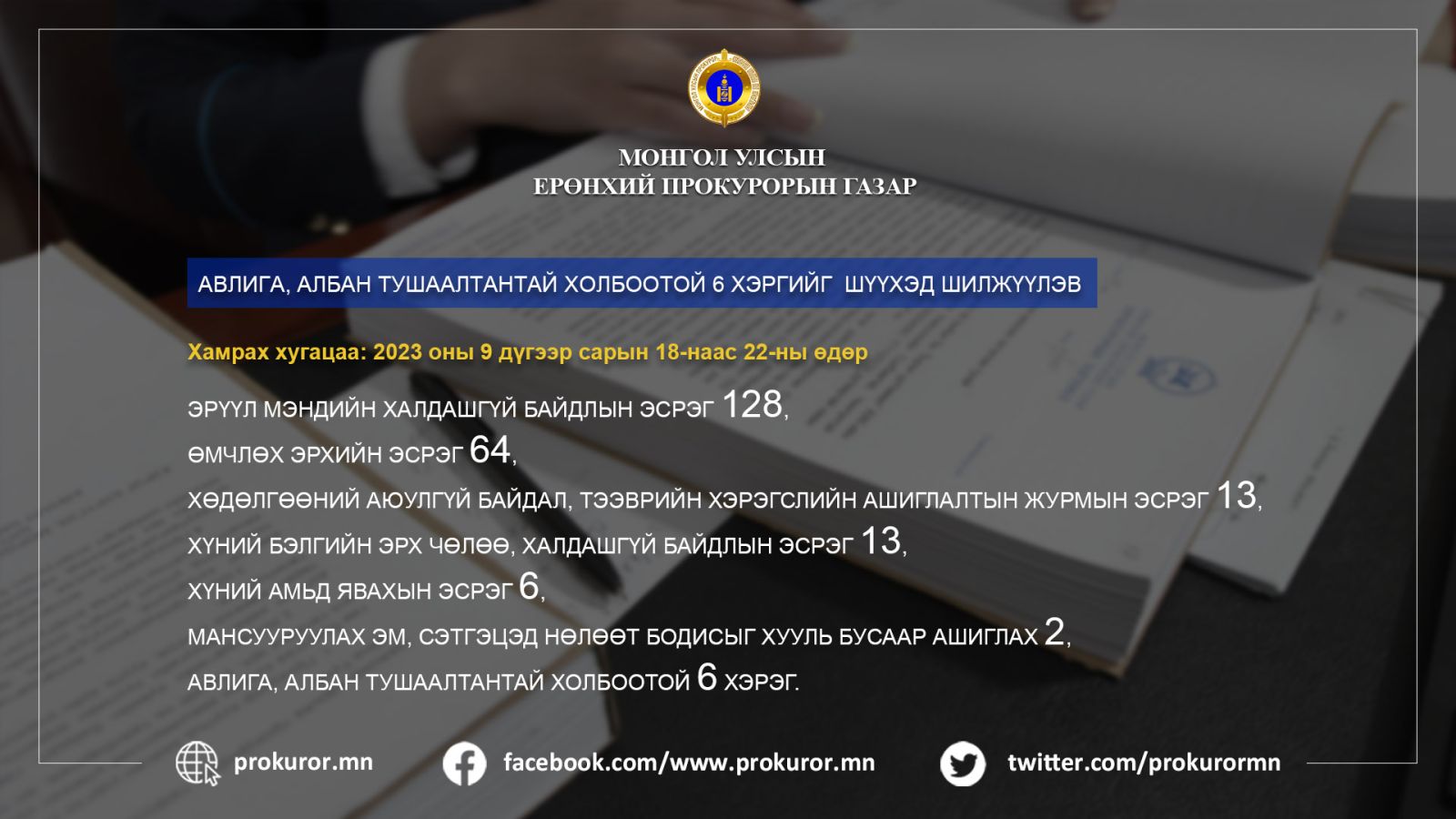 Улсын Ерөнхий прокурорын газраас есдүгээр сарын 18-22-ны өдөр нийт мөрдөн байцаалтын 2542 хэрэгт хяналт тавьж, 232 хэрэгт яллах дүгнэлт үйлдэж, шүүхэд шилжүүлжээ.