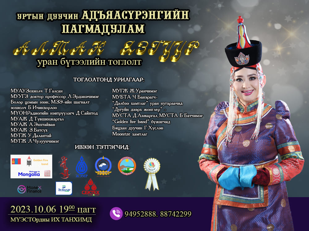 Хонгор нутгаас төрөн гарсан Соёлын тэргүүний ажилтан, Уртын дуучин Адъяасүрэнгийн Пагмадулам анхны бие даасан “Алтан язгуур” уран бүтээлийн тоглолтоо хийх гэж байна. Тоглолт аравдугаар сарын 06-ны өдөр МҮЭСТО-нд болно.
